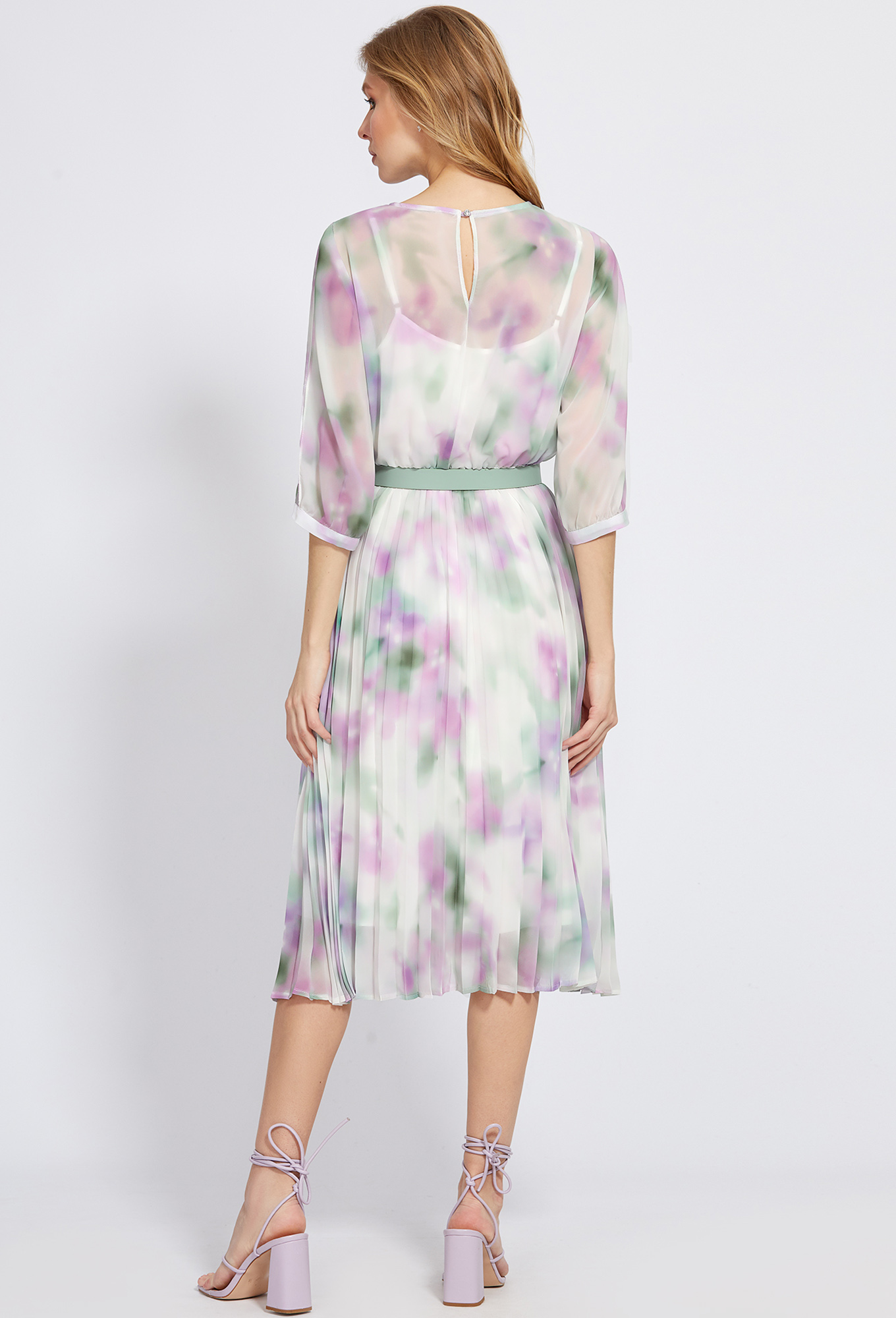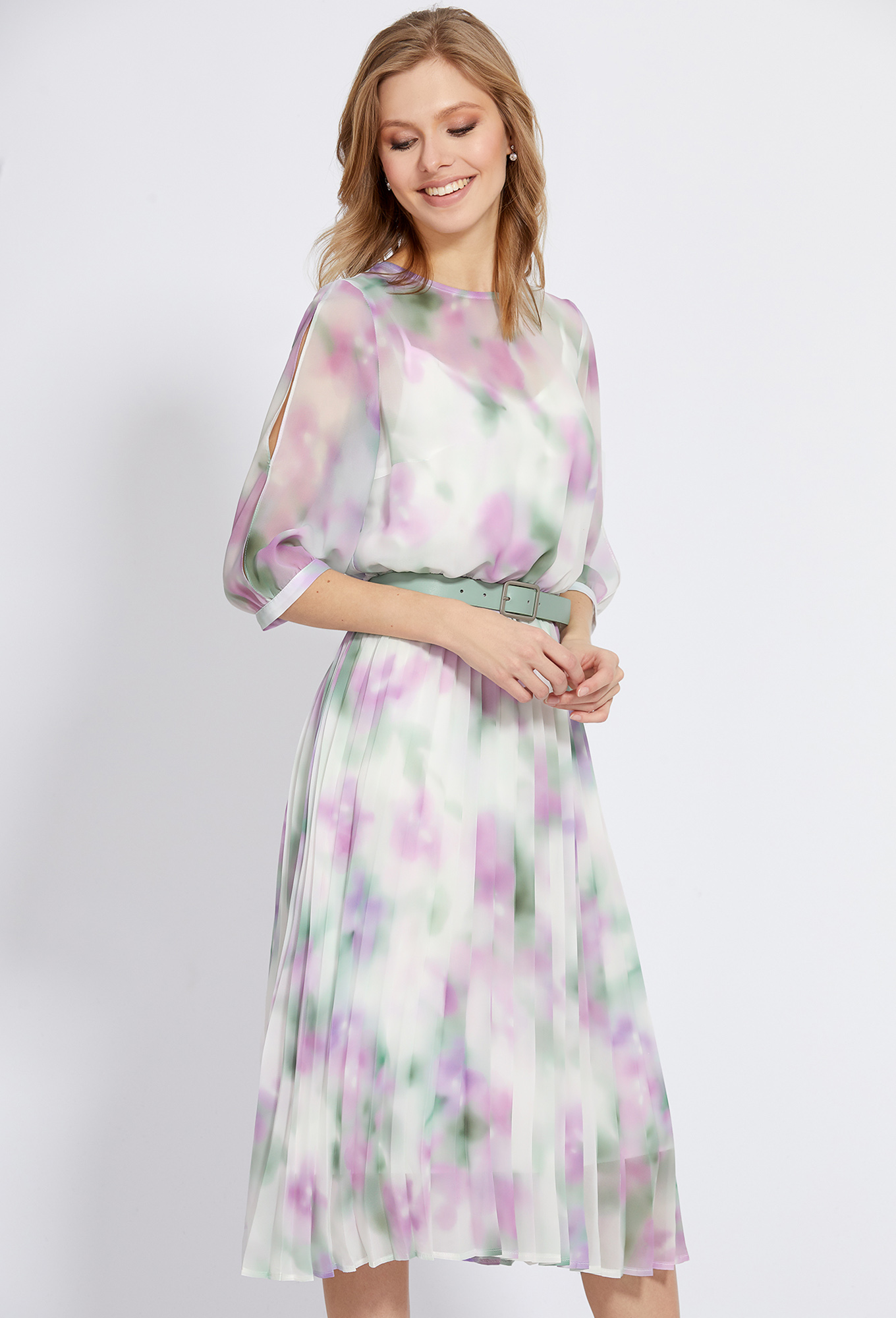 Модель: Базалини 4894 цветы Рост:..показать 164 см (девушка на фото ростом 170см) Сезон: Весна-Лето Тип ткани: 100% полиэстер + подклад 100% вискозыЭто элегантное платье из шифона подойдёт для любого важного события – свадьбы, юбилея или торжественного ужина! Платье имеет романтичный, эксклюзивный принт, округлый вырез горловины, укороченные рукава со щелевидными разрезами, присборенные по низу узкими манжетами и скрытую резинку по талии. Плиссированная юбка, напоминающая лучи солнца, придаёт фигуре изящные движения. Платье застёгивается на ювелирную пуговицу сзади и комплектуется с нижним платьем из комфортной 100% вискозной ткани. Чтобы сделать модель ещё более эффектной, линию талии подчеркнули стильным поясом с пряжкой.