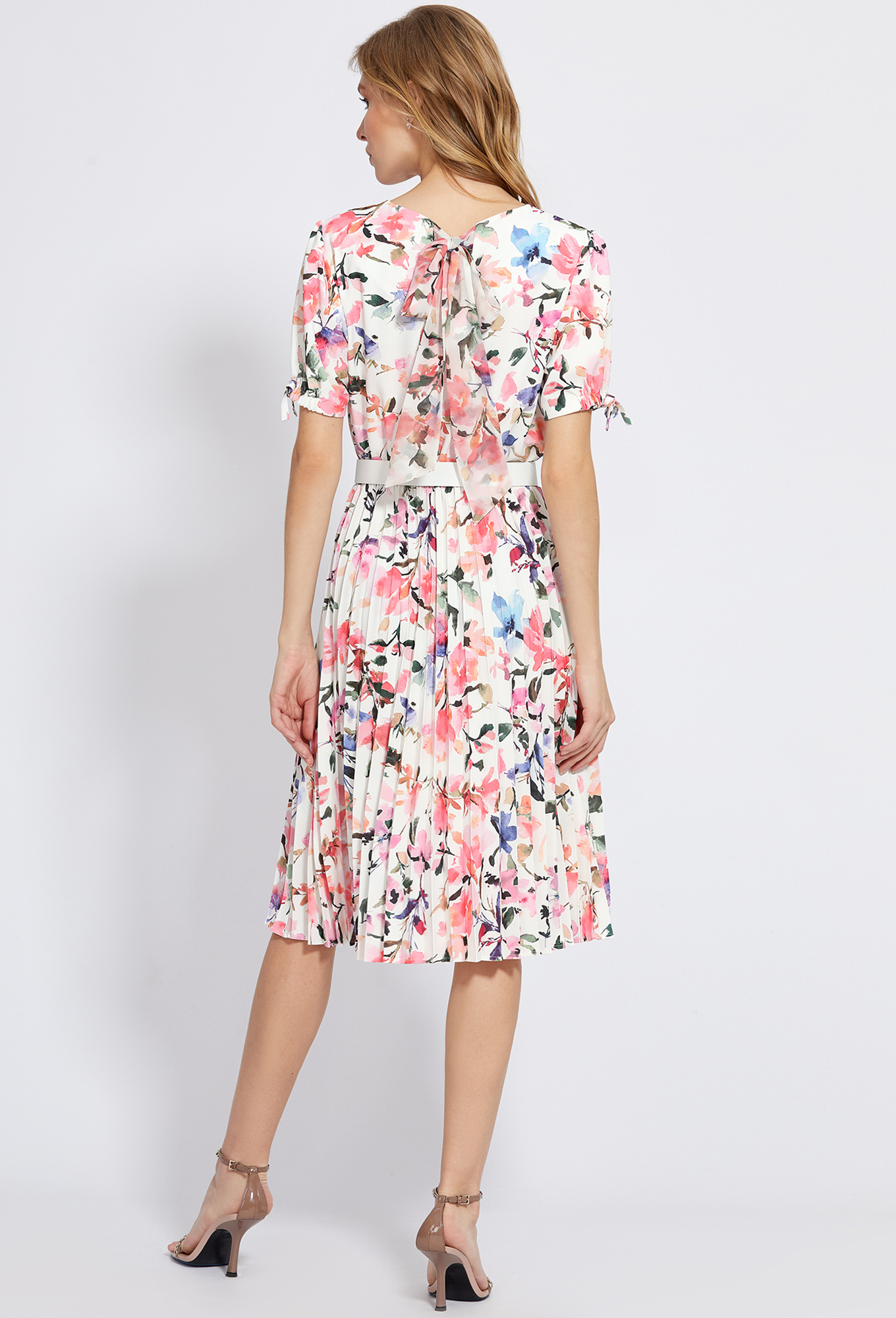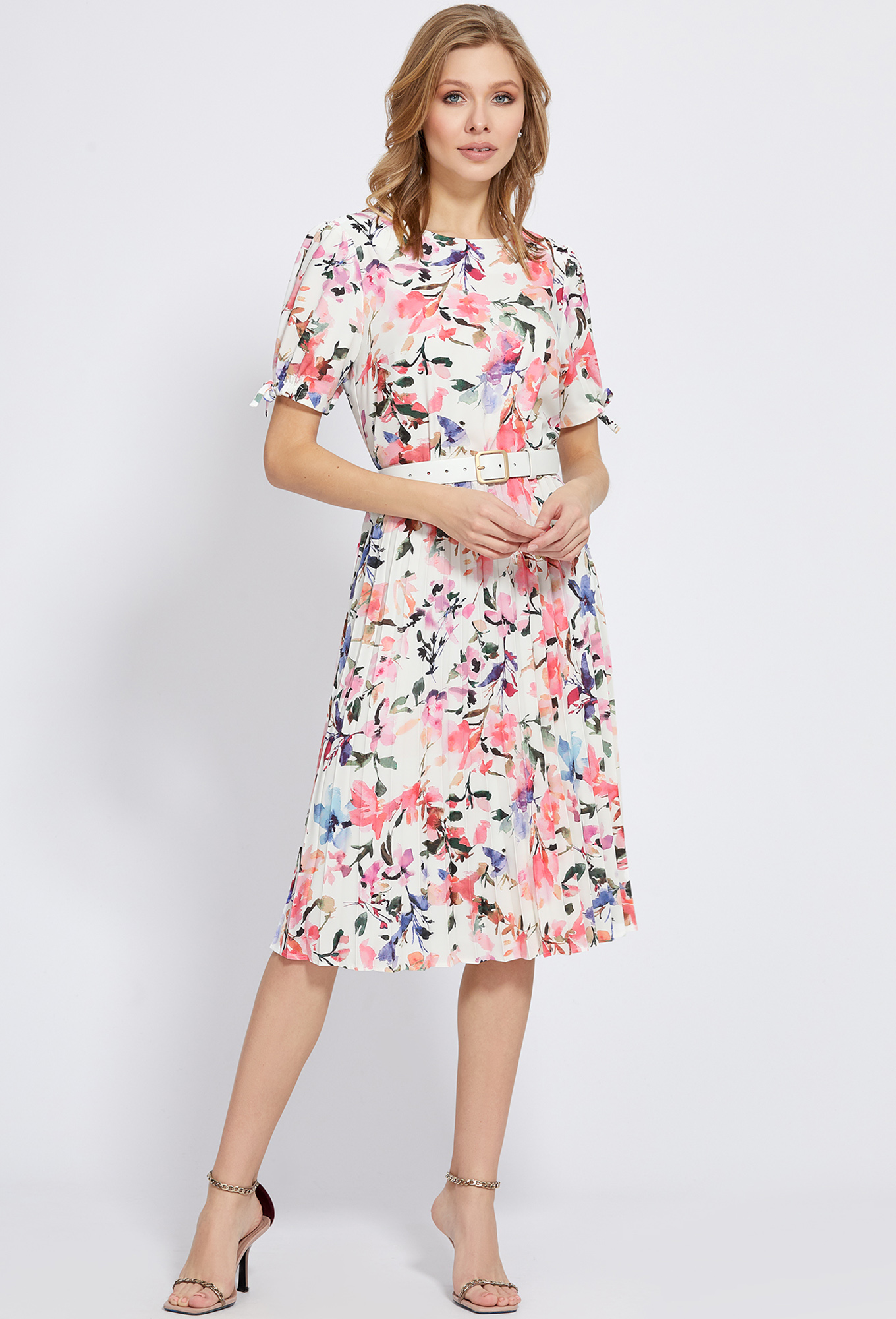Модель: Базалини 4897 цветы Рост:..показать 164 см (девушка на фото ростом 170см) Сезон: Весна-Лето Тип ткани: 100% полиэстерКрасивое платье Х-образного силуэта из приятной ткани с романтическим акварельным, цветочным принтом, округлым вырезом горловины, рукавами-фонариками с завязками в виде бантиков, плиссированной юбкой, придающей невероятную лёгкость модели и талией на резинке. Изюминка модели – ниспадающие завязки по спинке, которые можно завязать бантом из шифона в тон. Завершить образ помогает пояс-ремень с пряжкой.
