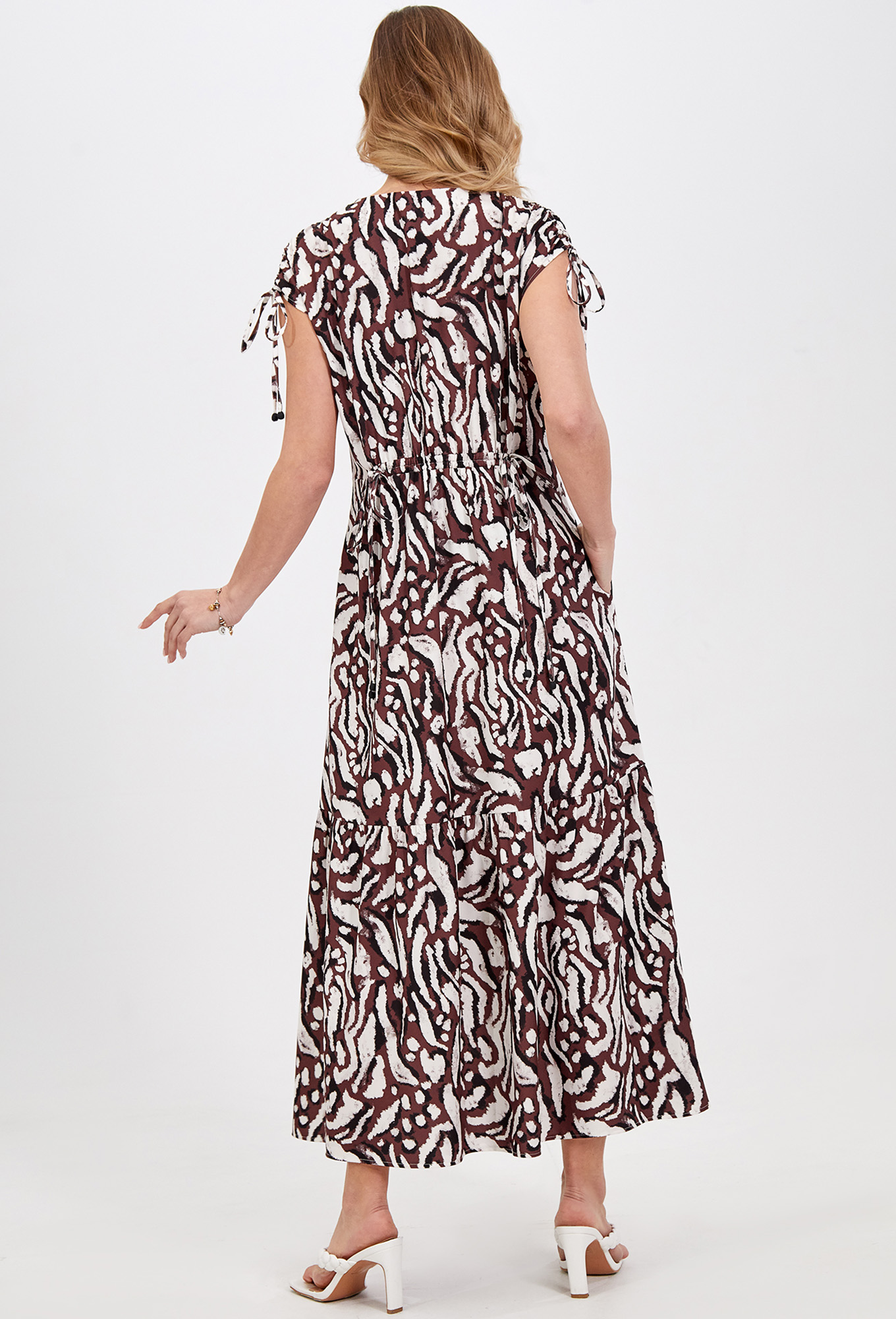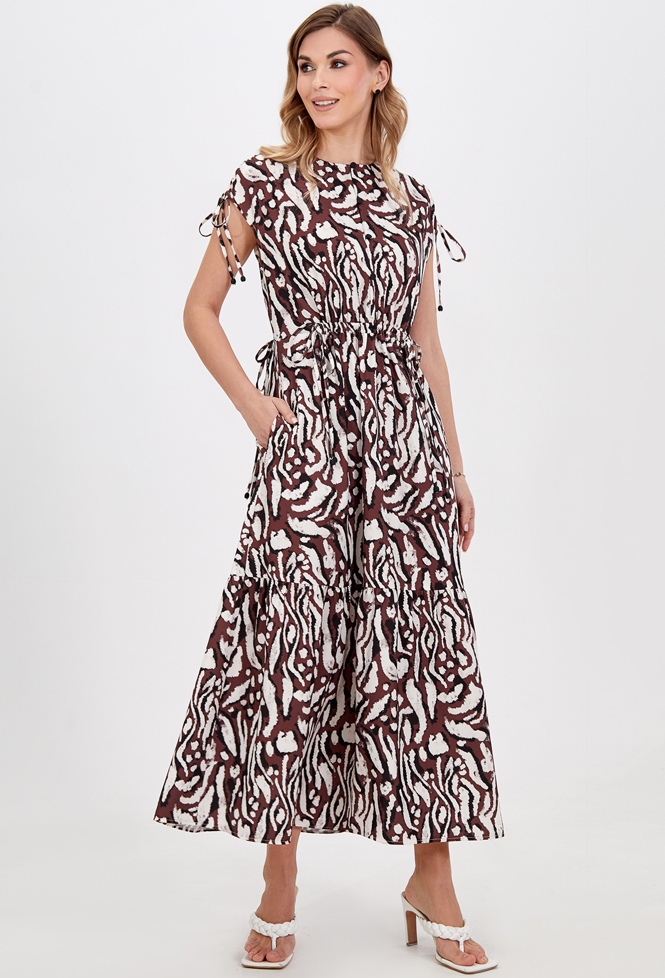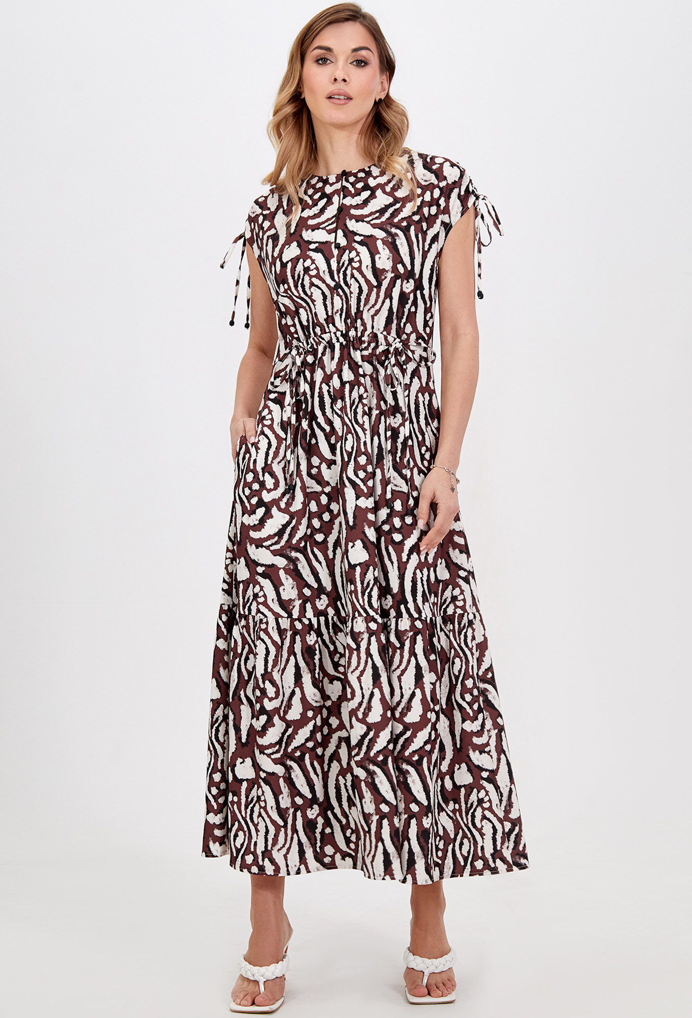 Модель: Базалини 5022 коричнево-бежевый..показатьi> Рост: 164 см (девушка на фото ростом 170см) Сезон: Весна-Лето Тип ткани: 100% вискозаЭффектное платье длины мидакси со щелевидной застёжкой по переду на навесные петли и