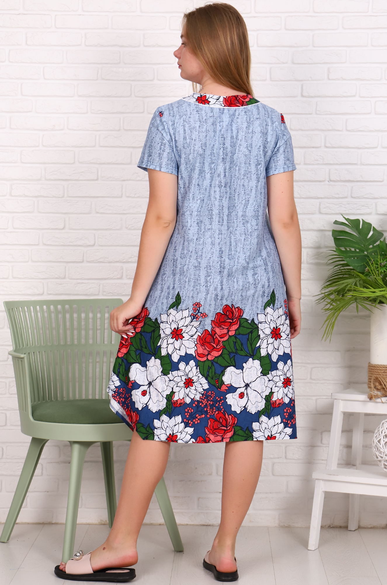 Лёгкое хлопковое платье с коротким рукавом свободного, трапециевидного кроя. Оригинальным эту простую модель делает асимметричное оформление низа.