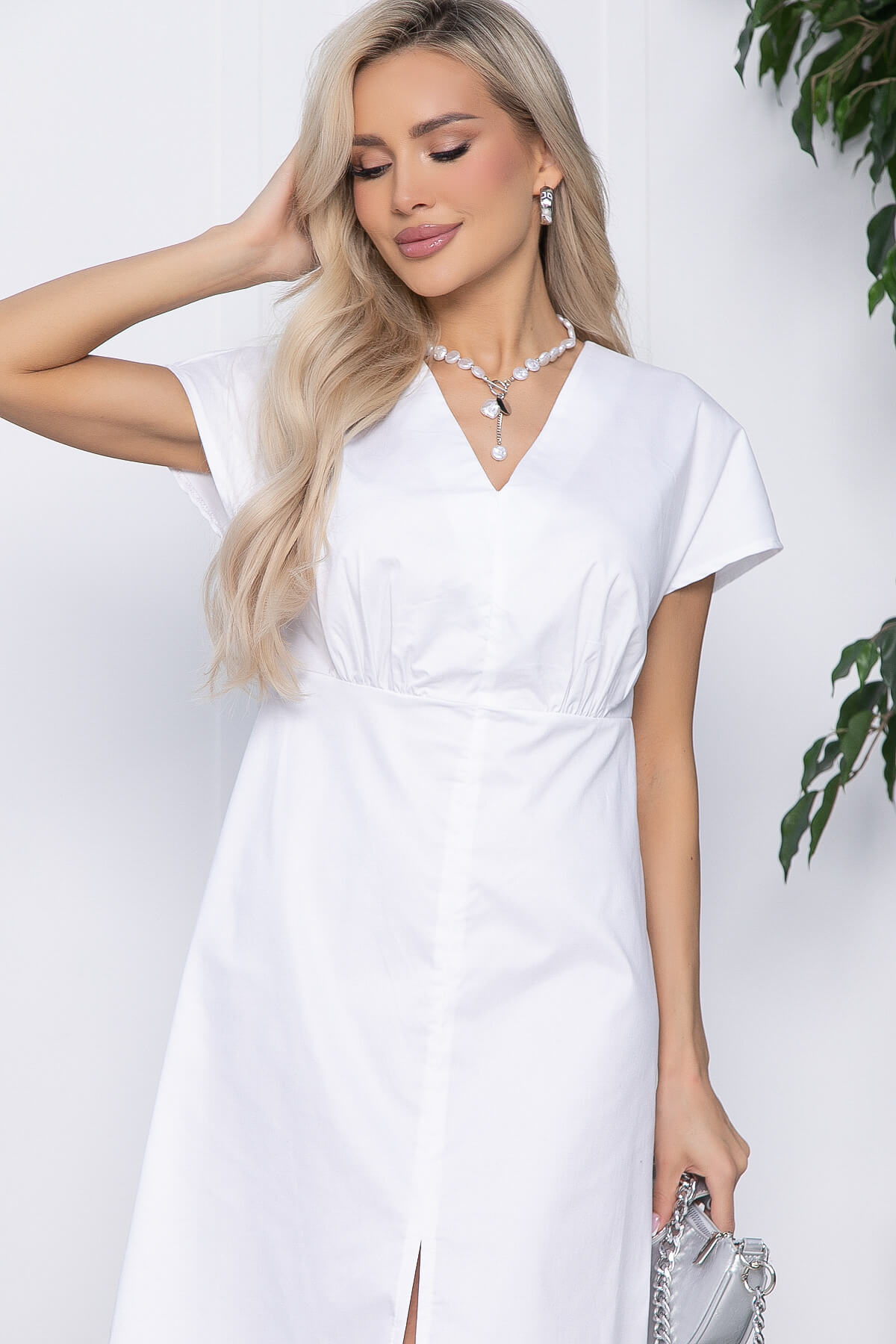 Представляем вашему вниманию изысканное белое платье, которое станет незаменимым элементом вашего гардероба! Благодаря универсальному белому цвету, это платье легко сочетается с любой обувью и аксессуарами. Дизайн платья включает в себя удлинённое плечо и безрукавный фасон, что придаёт ему утончённый вид. Сзади расположена потайная молния, которая обеспечивает удобство при надевании. V-образный вырез горловины и юбка-трапеция с разрезом спереди добавляют нотку изысканности и стиля.