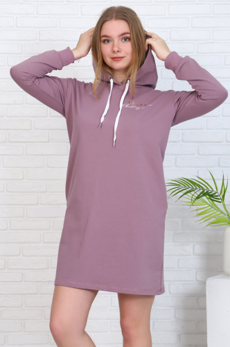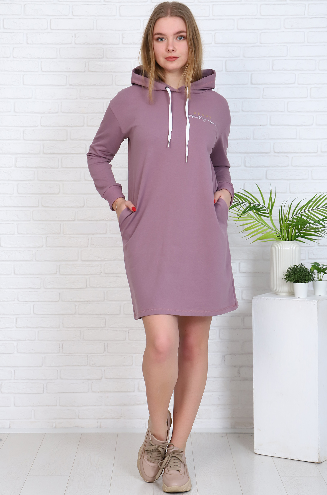 Модное спортивное платье для повседневневного образа. Модель прямого кроя в стиле "оверсайз", с удобным капюшоном, рукав на эластичном манжете, в боковых швах карманы. На груди аккуратный каллиграфический принт.