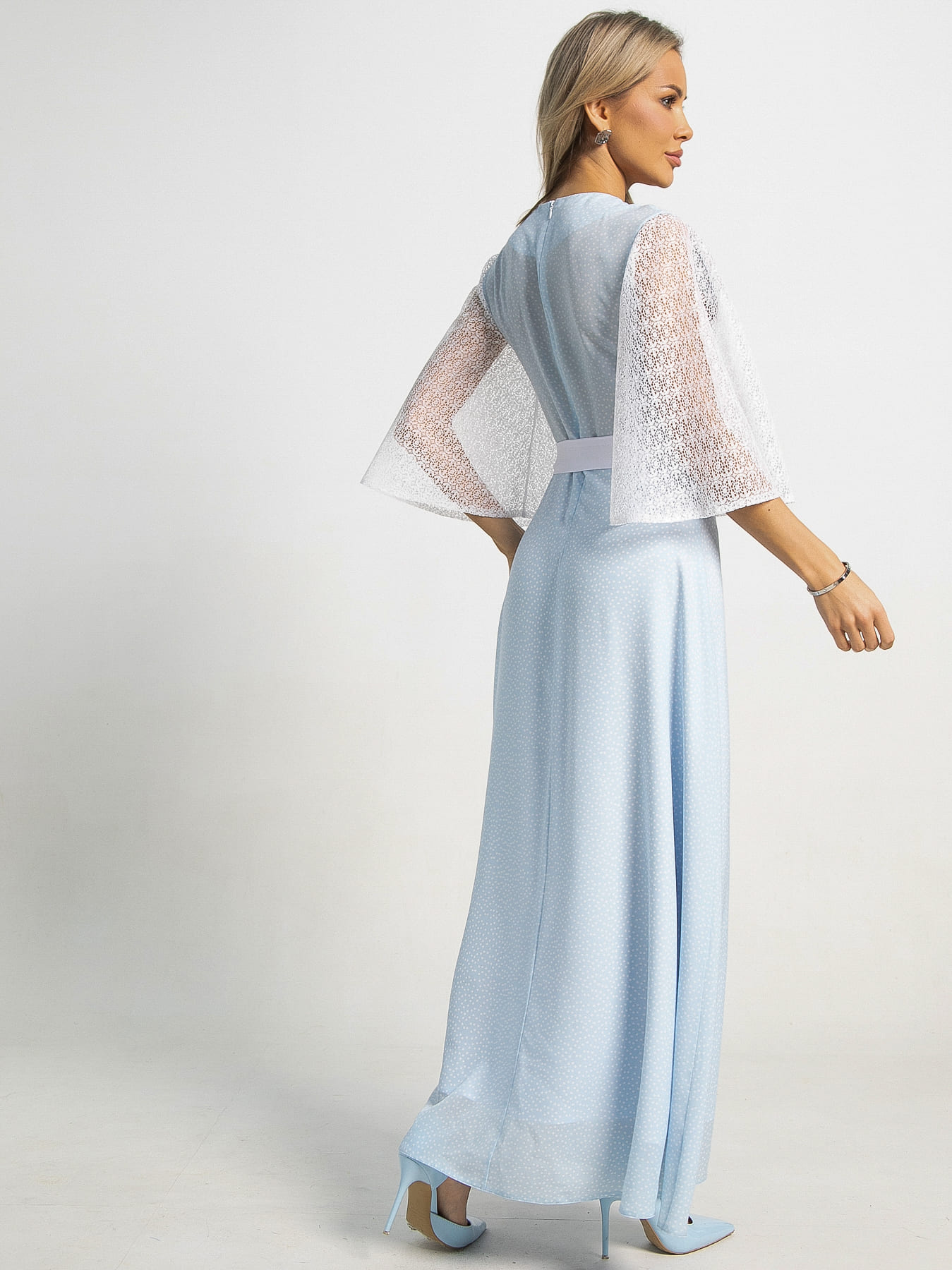 Элегантное комбинированное платье полной длины с приталенным силуэтом идеально подчеркнет вашу женственность. Застежка на молнии по спинке обеспечивает комфортную посадку, а округлая горловина придает образу классическую утонченность. Втачные рукава средней длины выполнены из белого кружева в виде расклешенных крылышек, добавляя романтичности и изящества.