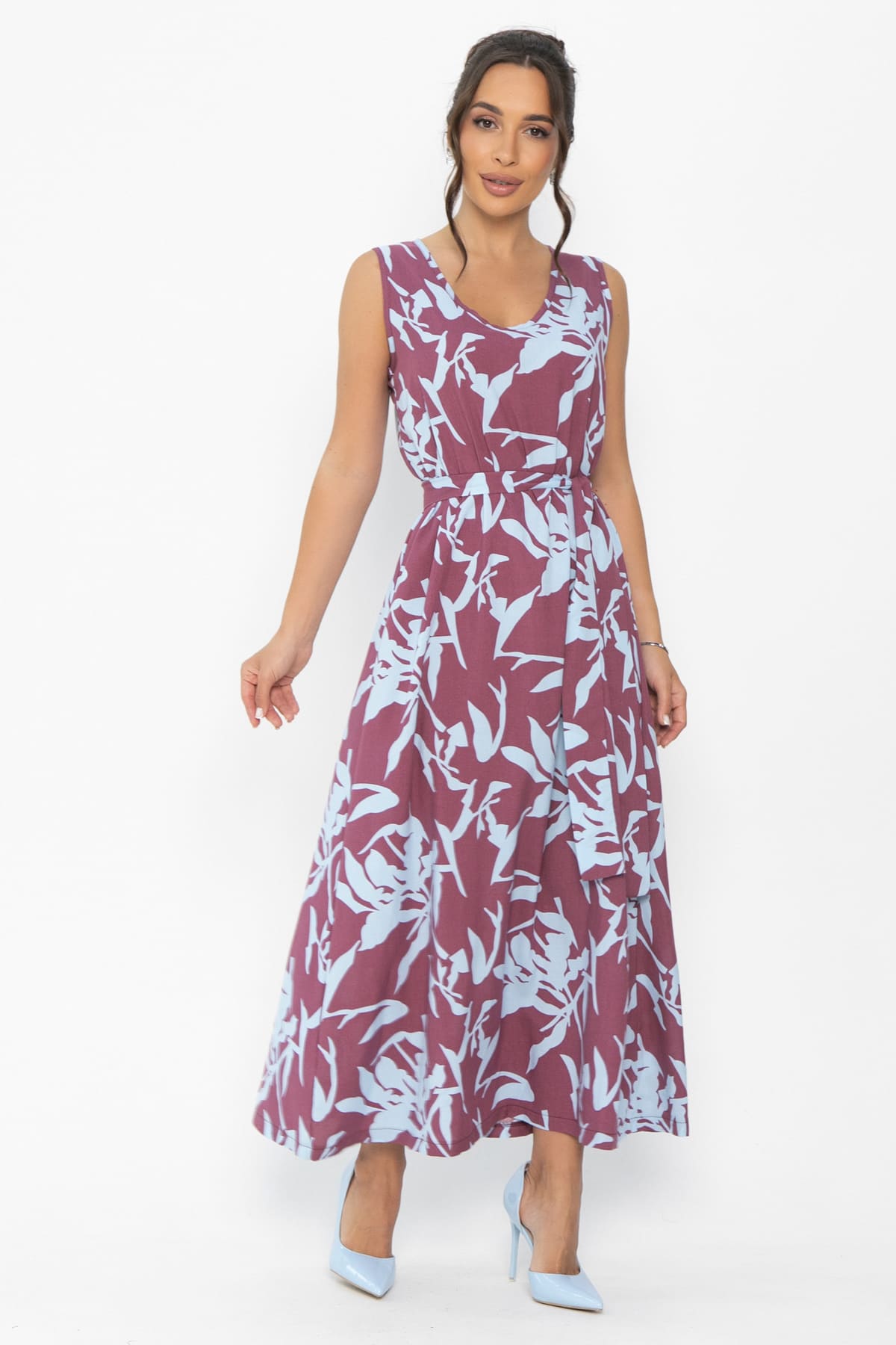 Платье-сарафан свободного кроя, выполненный из штапеля, — это то, что нужно для беззаботного отдыха и тёплых дней. Его очаровательный принт создаст романтичный и женственный образ. В комплекте есть пояс из основной ткани, который поможет подчеркнуть талию. Окантовка аккуратно обработана по краю горловины.