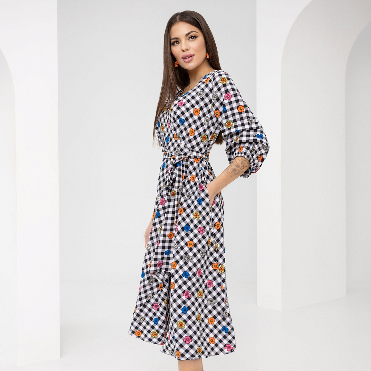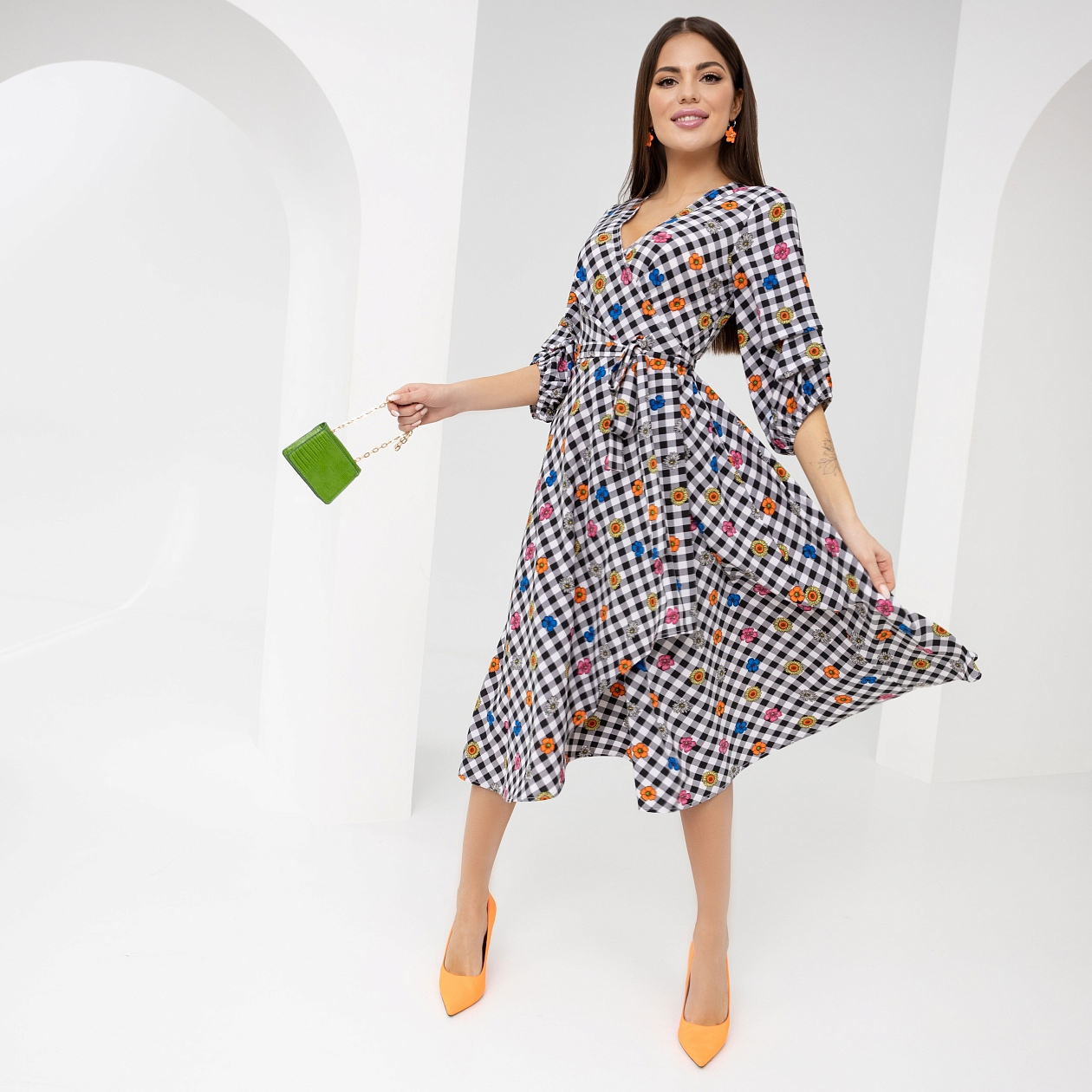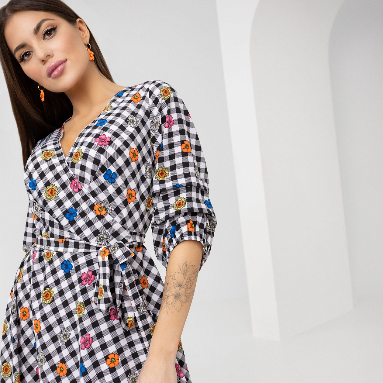 Любимое платье с интересным сочетанием принтов. Акцентный пояс и откровенное декольте. Рукав на сборках открывает запястье, подчеркивает его хрупкость. Стиль в деталях!