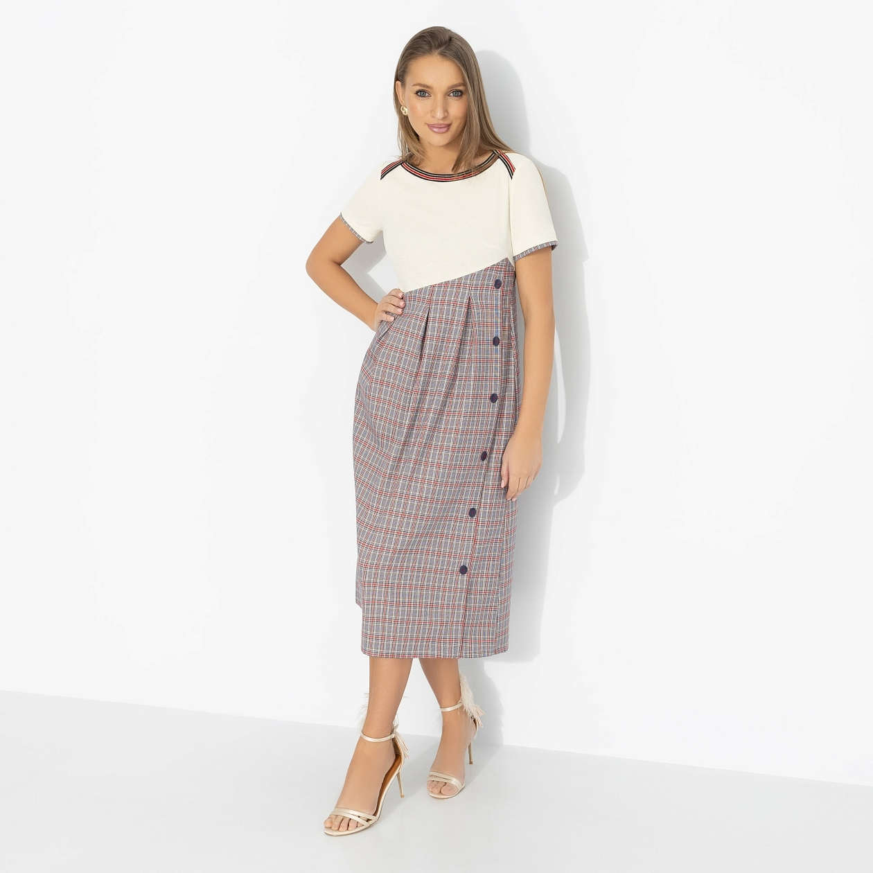Стильная теорема доказана: если к чёткой геометрии добавить лёгкость, получится идеальный силуэт. Лаконичный верх из трикотажа – как аккуратная формула без лишних знаков, а юбка в клетку из костюмной ткани выстраивает ритм и движение твоего образа. Пуговицы добавляют графики, линия талии собирает композицию. Отличница по стилю? Конечно, это про тебя.