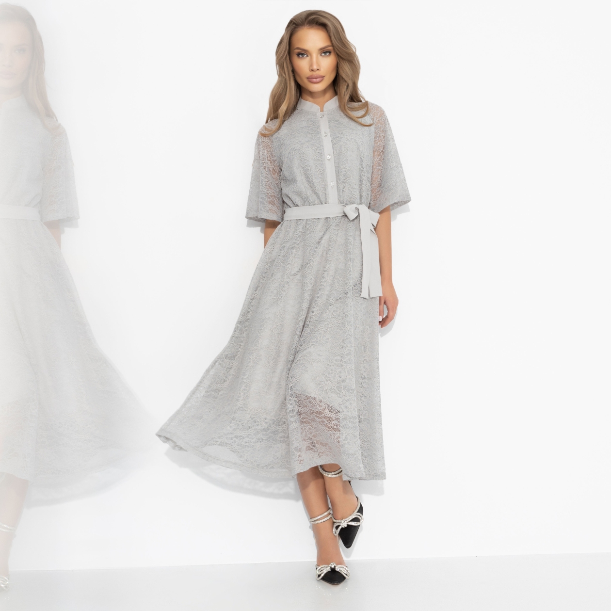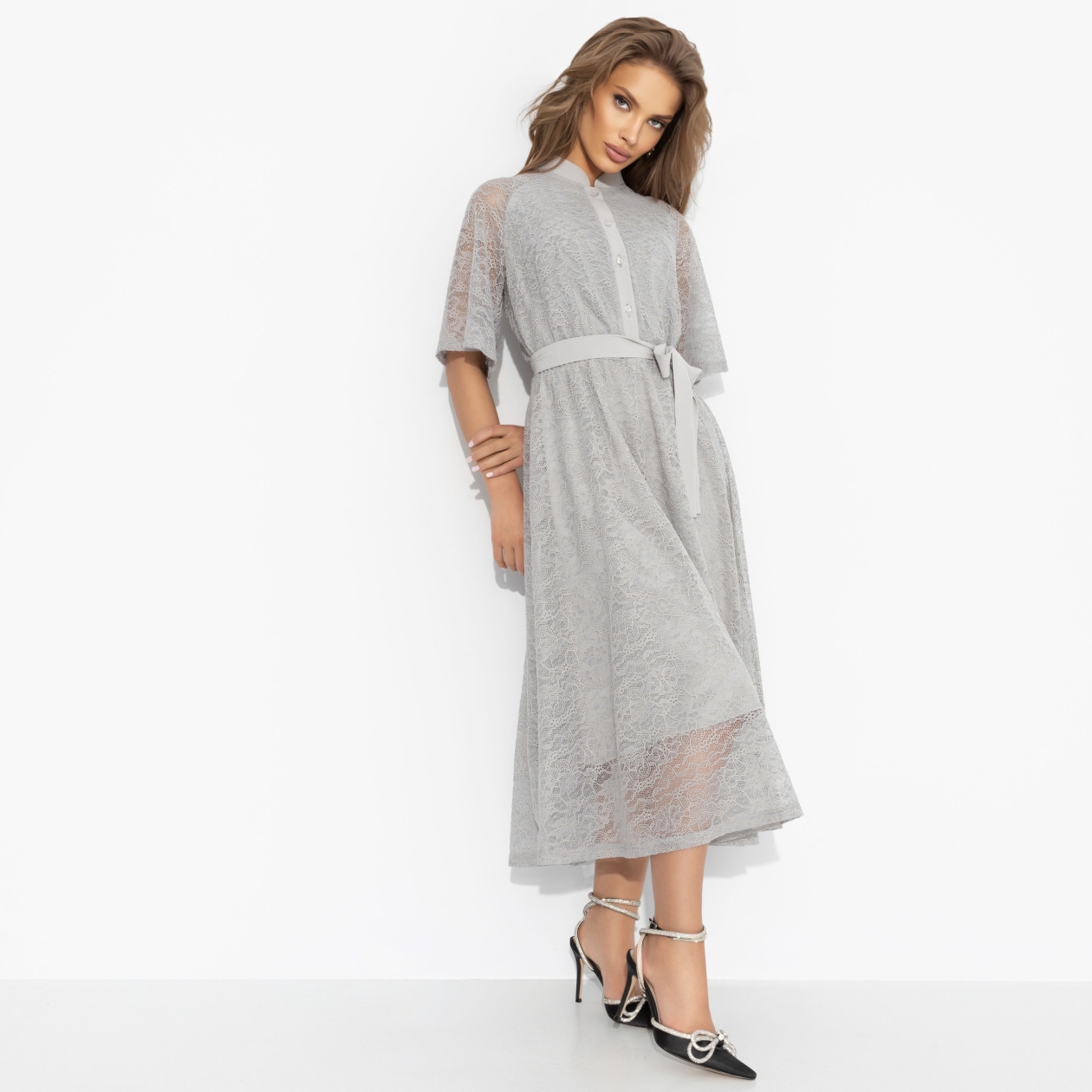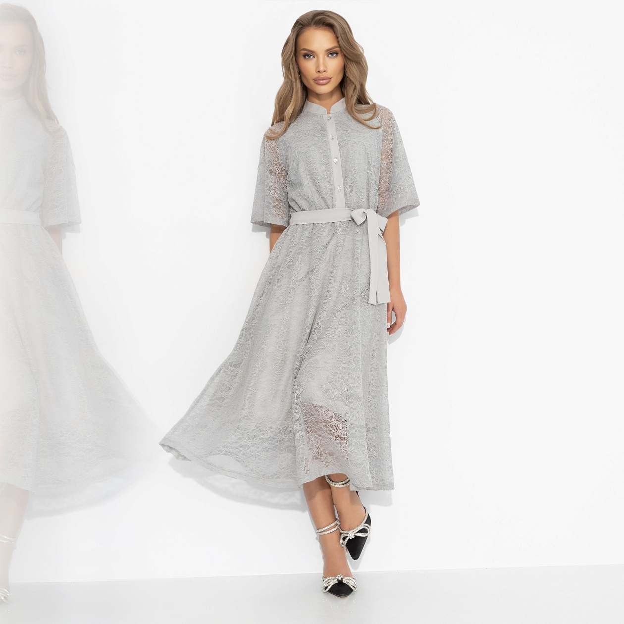 Однажды в Милане она увидела платье, будто сотканное из лунного серебра. Тонкое кружево отражало блеск витрин и сияние ее восхищенного взгляда. Платье ЧАРУТТИ ‒ для тех, кто любит путешествовать и чувствует себя главной драгоценностью в любой компании. Платье миди из нежного кружева и комфортной подкладкой, с поясом для акцента на талии. Серебристый оттенок словно подсвечивает образ. Для мечтательниц и эстеток.