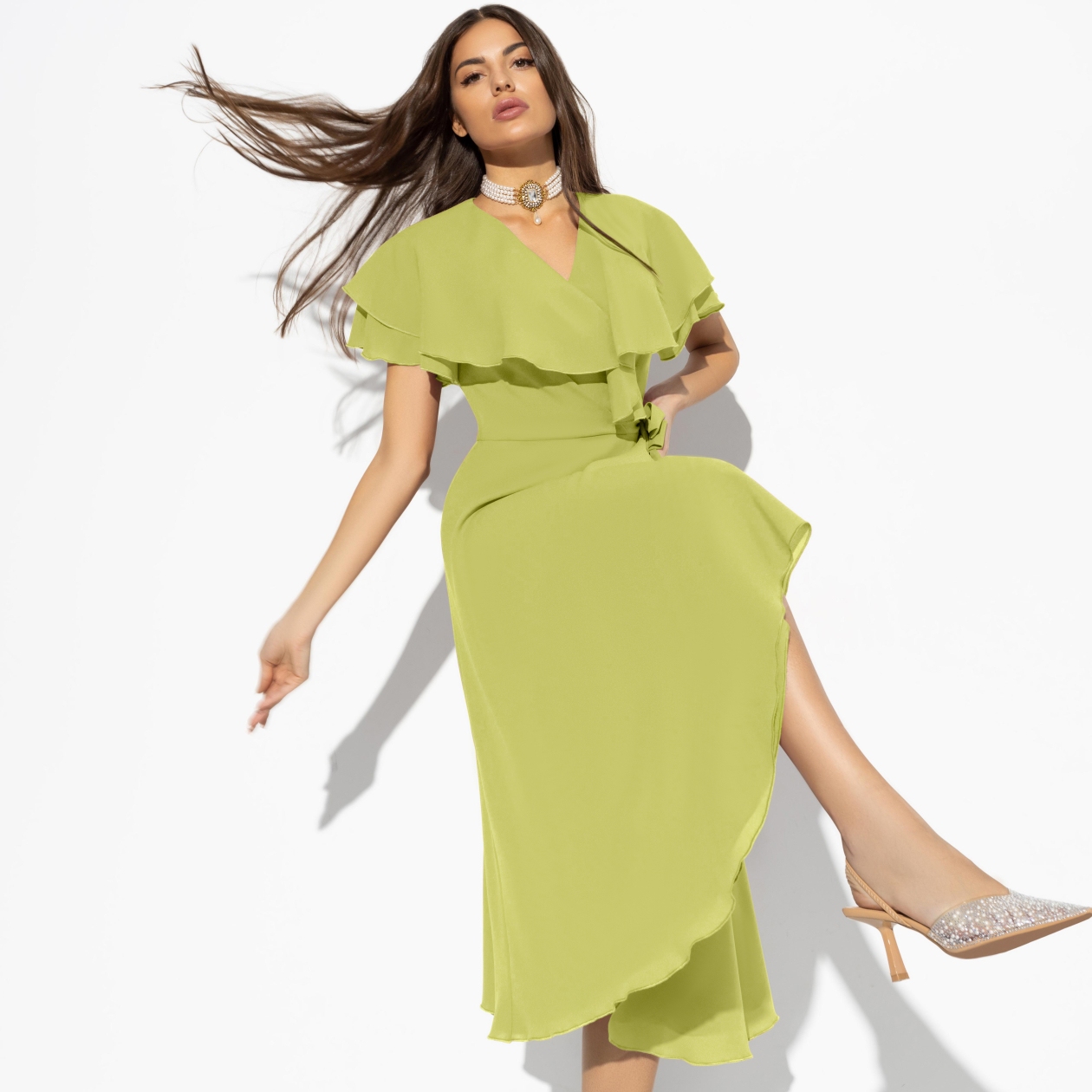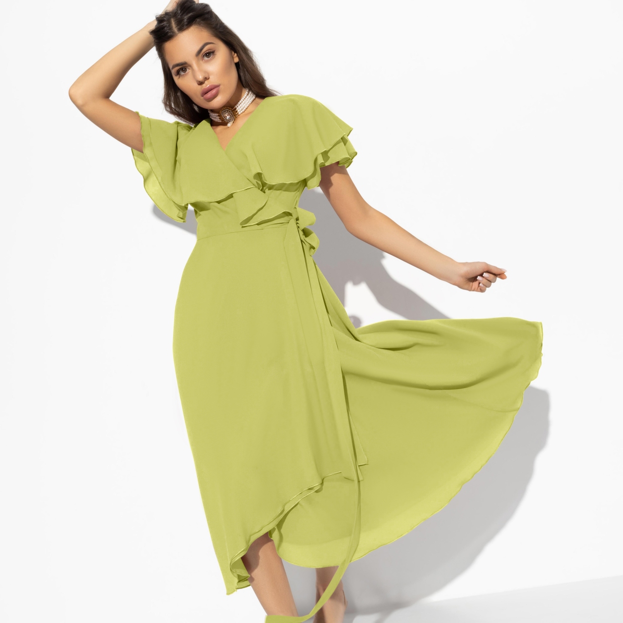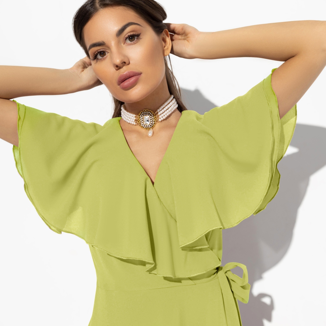 Парить над землей от счастья лучше эффектно. Салатовое великолепее от CHARUTTI создано для того, чтобы сделать мир красивее. Платье станет любимым для всех в вашем окружении, обещаем. Всем сотрудницам нашего офиса оно уже полюбилось. Платье приталенное, на запах.