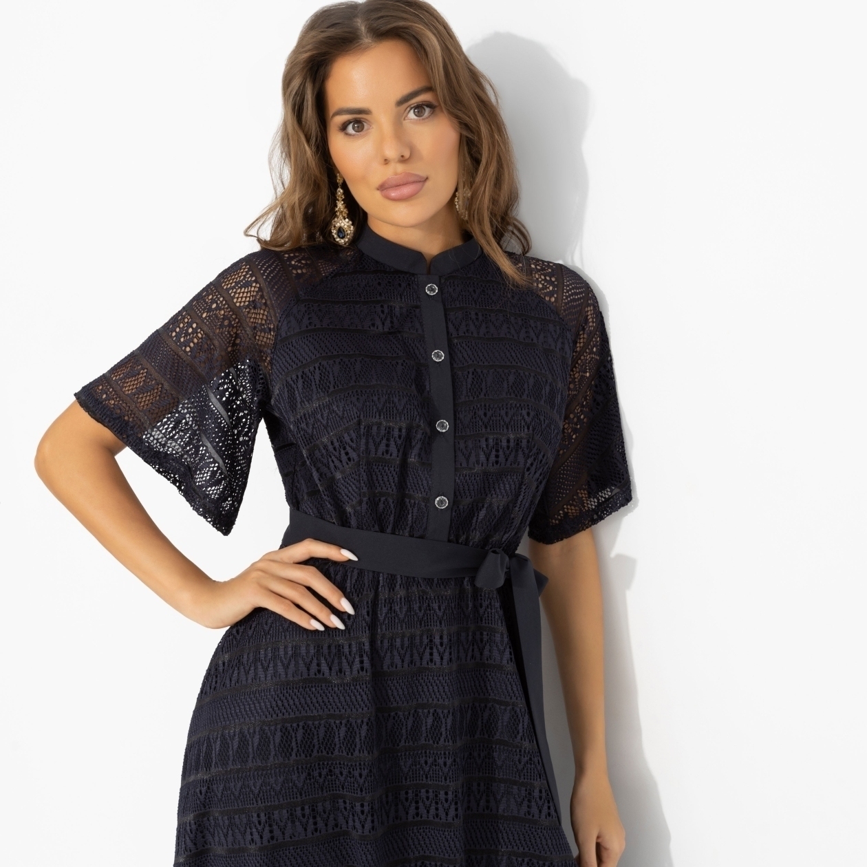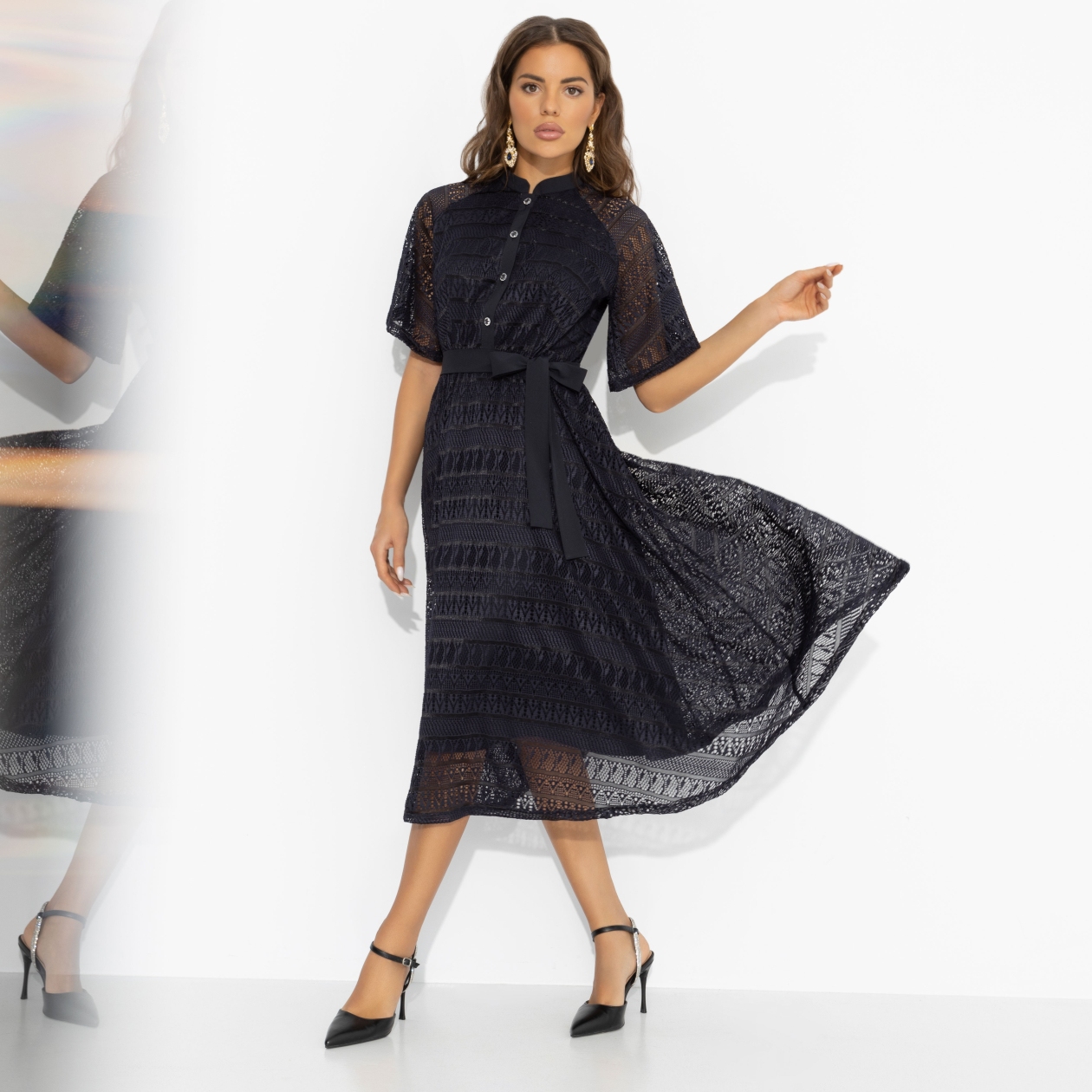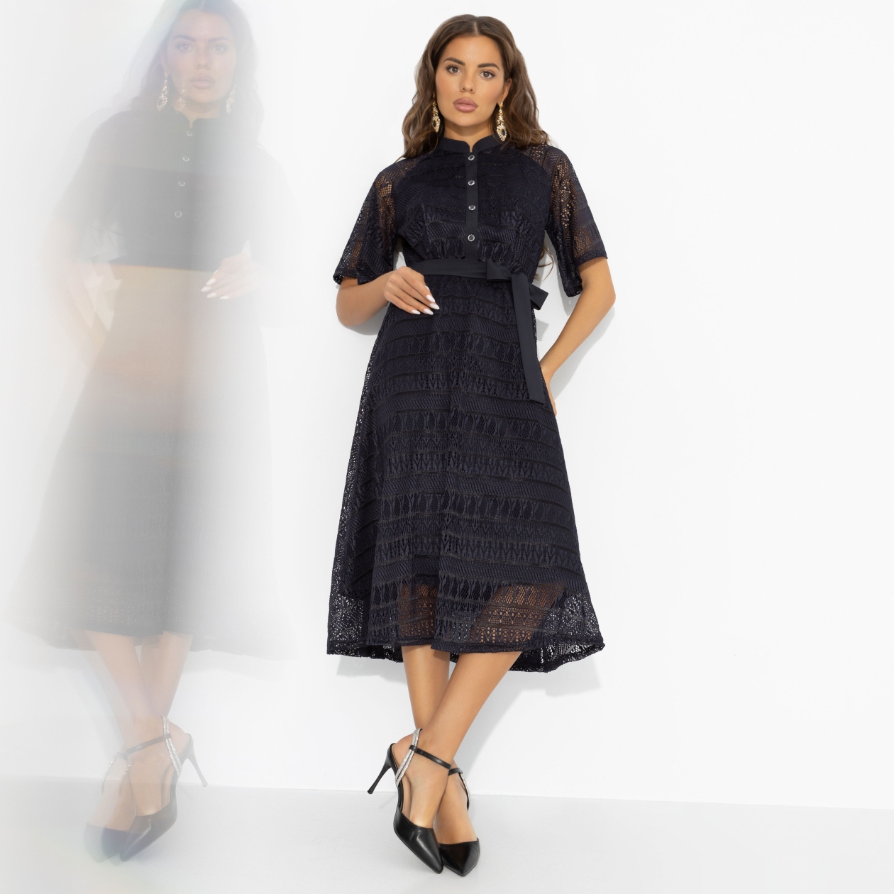 Она выходит из дома, не спеша затягивая пояс. В этом платье всё складывается само: силуэт, настроение, взгляды. «Моя итальянская история» создаёт ощущение таинства, где любовь не ищут – она появляется в паузах, жестах и уверенности, с которой вы идёте навстречу вечеру. Ажурное платье в длине миди, аккуратной планкой пуговиц и поясом подчёркивает талию, сохраняя образ сдержанным и утончённым. Многослойный низ и силуэт клёш придаёт наряду праздничность, не нарушая чёткости линий – идеальный баланс между элегантностью и праздничным настроением.