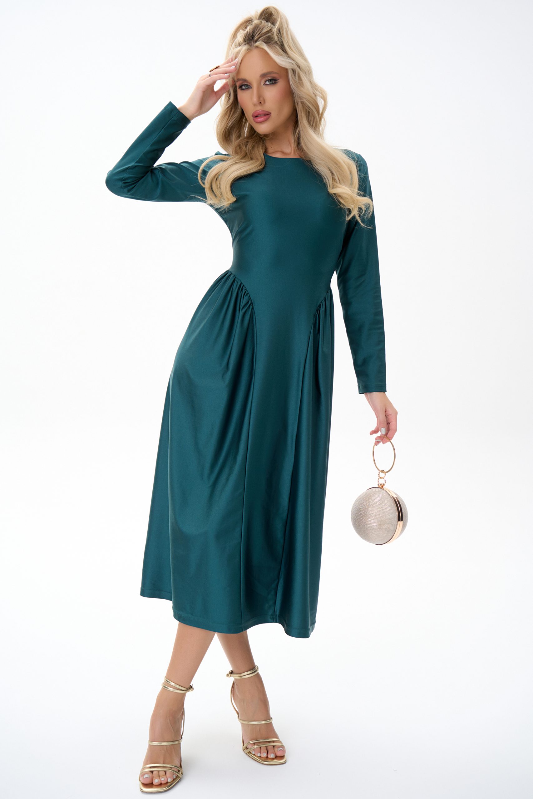 Платье «Донна» — универсальная модель в двух оттенках: классический чёрный и благородный изумруд. Элегантное миди-платье с завышенной линией талии и идеально гладкой посадкой лифа. Мягкие боковые сборки создают красивый объём юбки и подчёркивают женственный силуэт. Плотный эластичный материал с лёгким сатиновым блеском комфортно тянется и плавно драпируется. Лаконичная круглая горловина и длинный рукав делают модель подходящей как для рабочих будней, так и для мероприятий, ужинов и фотосъёмок. Платье смотрится дорого и подчёркивает фигуру без лишних деталей.