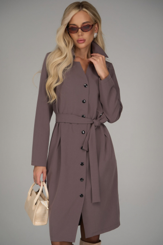 Элегантное платье-рубашка миди длины с акцентом на талию. Прямой силуэт корректируется поясом, создавая женственный образ. Классический отложной воротник и планка с пуговицами добавляют образу строгости и утончённости.