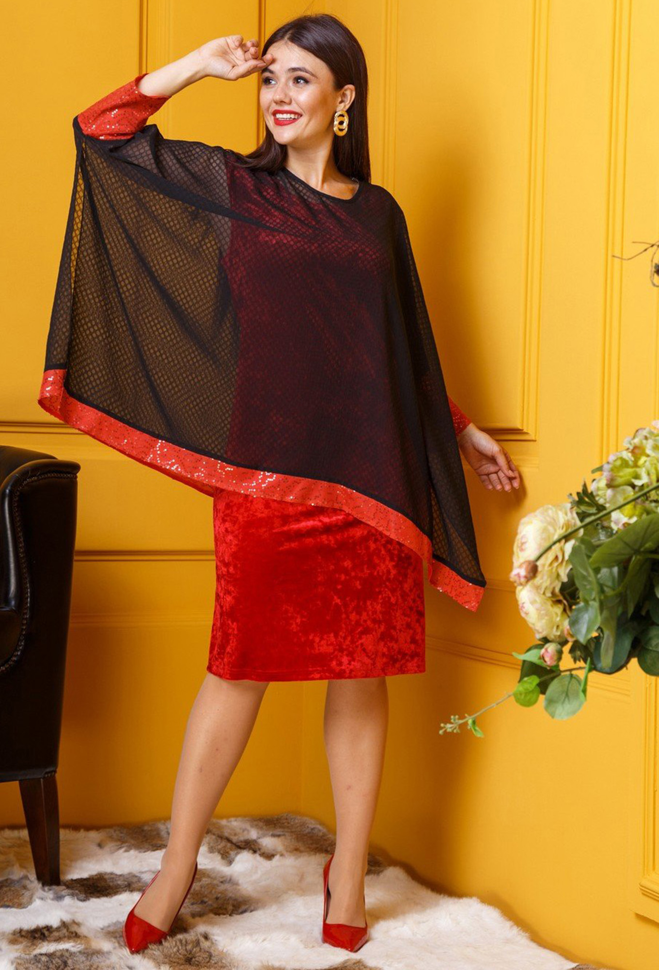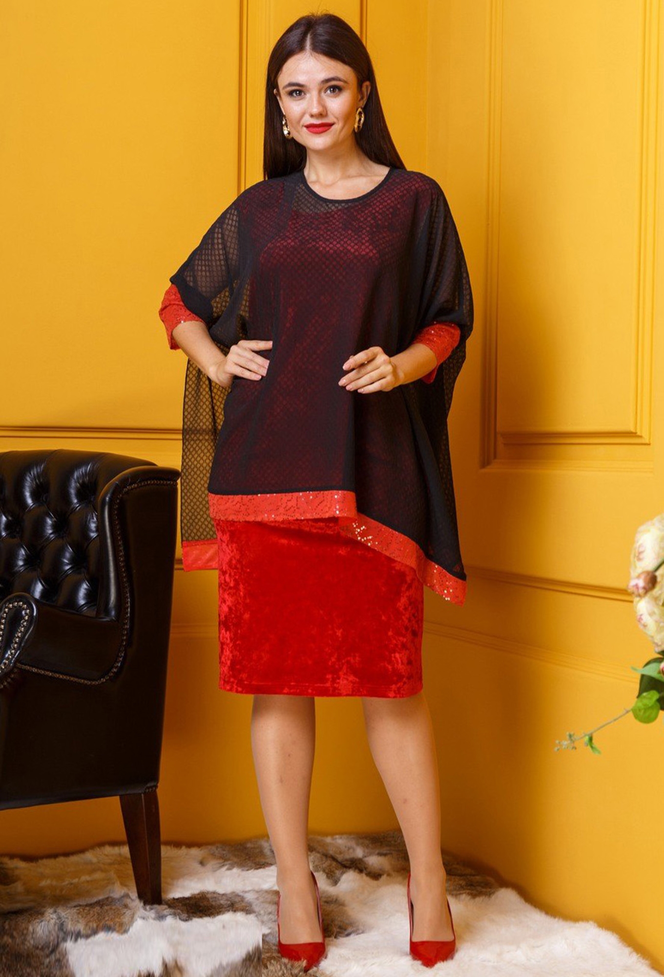 Модель: Анастасия 327 красный-черный ..показатьРост: 170 см (рост модели на фото 170см) Сезон: всесезонный Тип ткани: 1.Платье-полиэстер-95%,полиуретан-5%;2. полиэстер-100%Комплект женский 2-  х предметный: туника и платье.Платье полуприлегающего силуэта. Изделие выполнено из двух видов ткани:  черный трикотаж в серебрянную точку ( платье) и шифон( соты). Поверх платья шифоновая туника, которая является прекрасным дополнением к изделию и обрамлена пайетками. В тунике, в отличие от платья имеется рукав, который заканчивается широкой манжетой (пайетки). Длина изделия: 104 см. Длина рукава: 50 см. Рост: 170 см (рост модели на фото 170см) Сезон: всесезонный Тип ткани: 1.Платье-полиэстер-95%,полиуретан-5%;2. полиэстер-100%