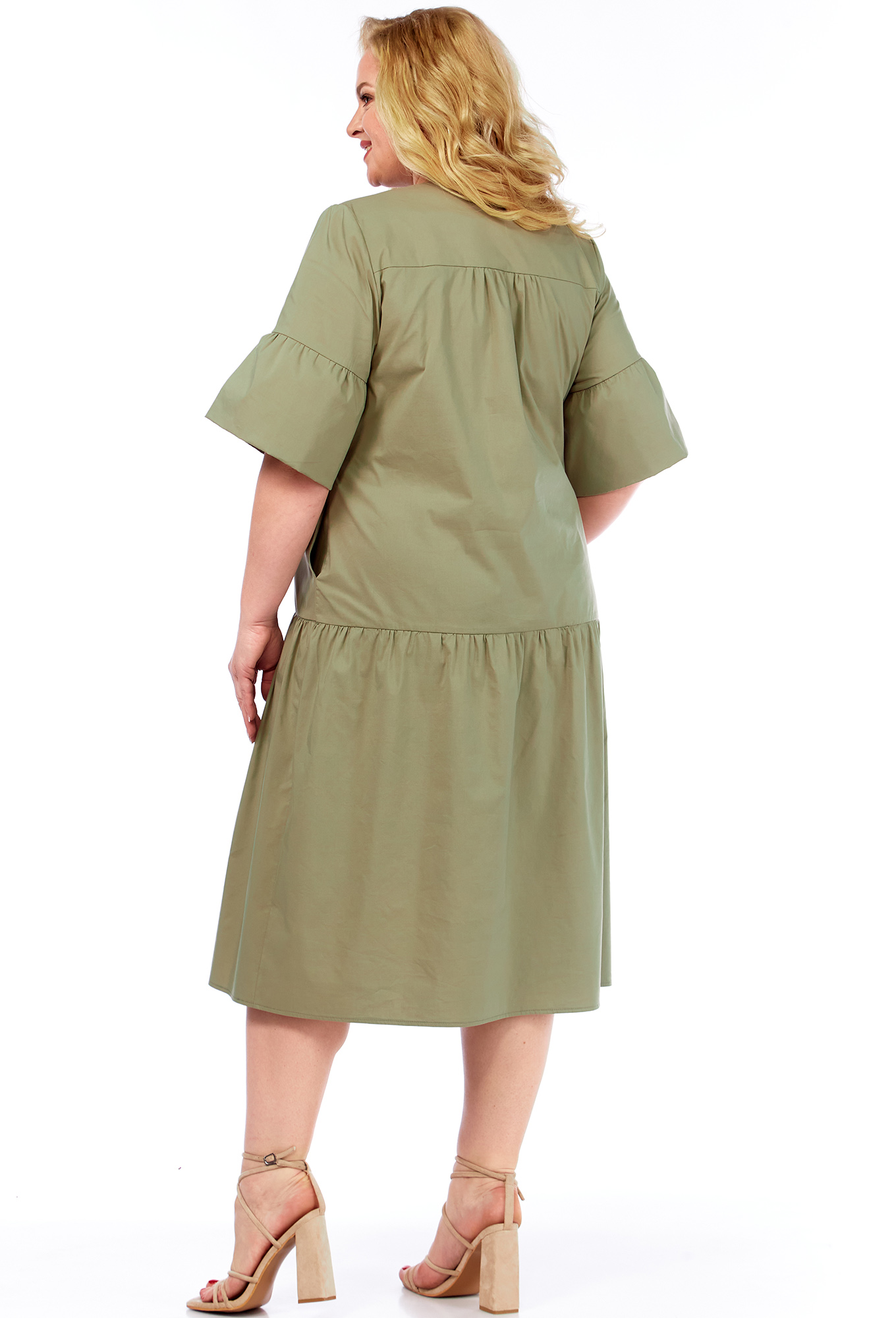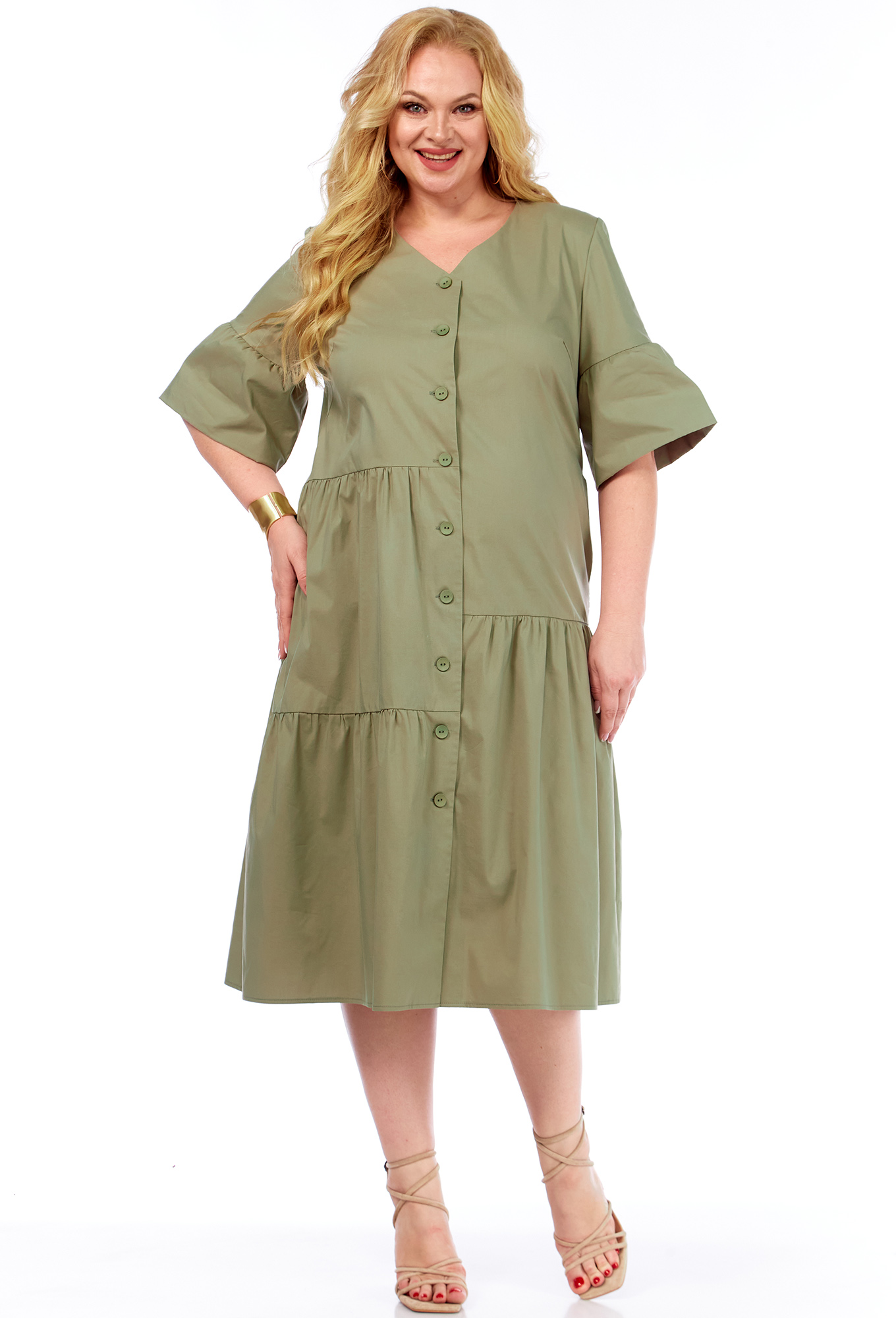 Модель: Элль-Стиль 2381 хаки Рост..показать: 164 см (девушка на фото ростом 164см) Сезон: Весна-Лето Тип ткани: Хлопок 70%, вискоза 30%Незаменимое летнее платье на жаркие дни. Изделие полуприлегающего силуэта очень комфортное, выполнено из хлопковой ткани. По переду отрезные присборенные детали, застежка на петли и пуговицы. Вырез горловины V-образной формы. Рукав «колокол», что добавляет легкость, создает воздушность образу. В боковых швах, предусмотрены функциональные карманы.: 164 см (девушка на фото ростом 164см)
