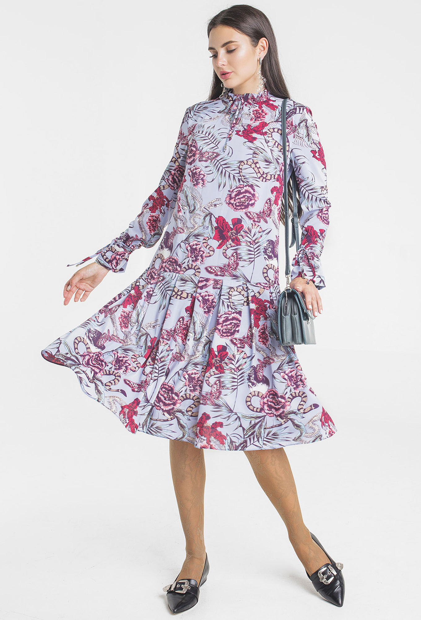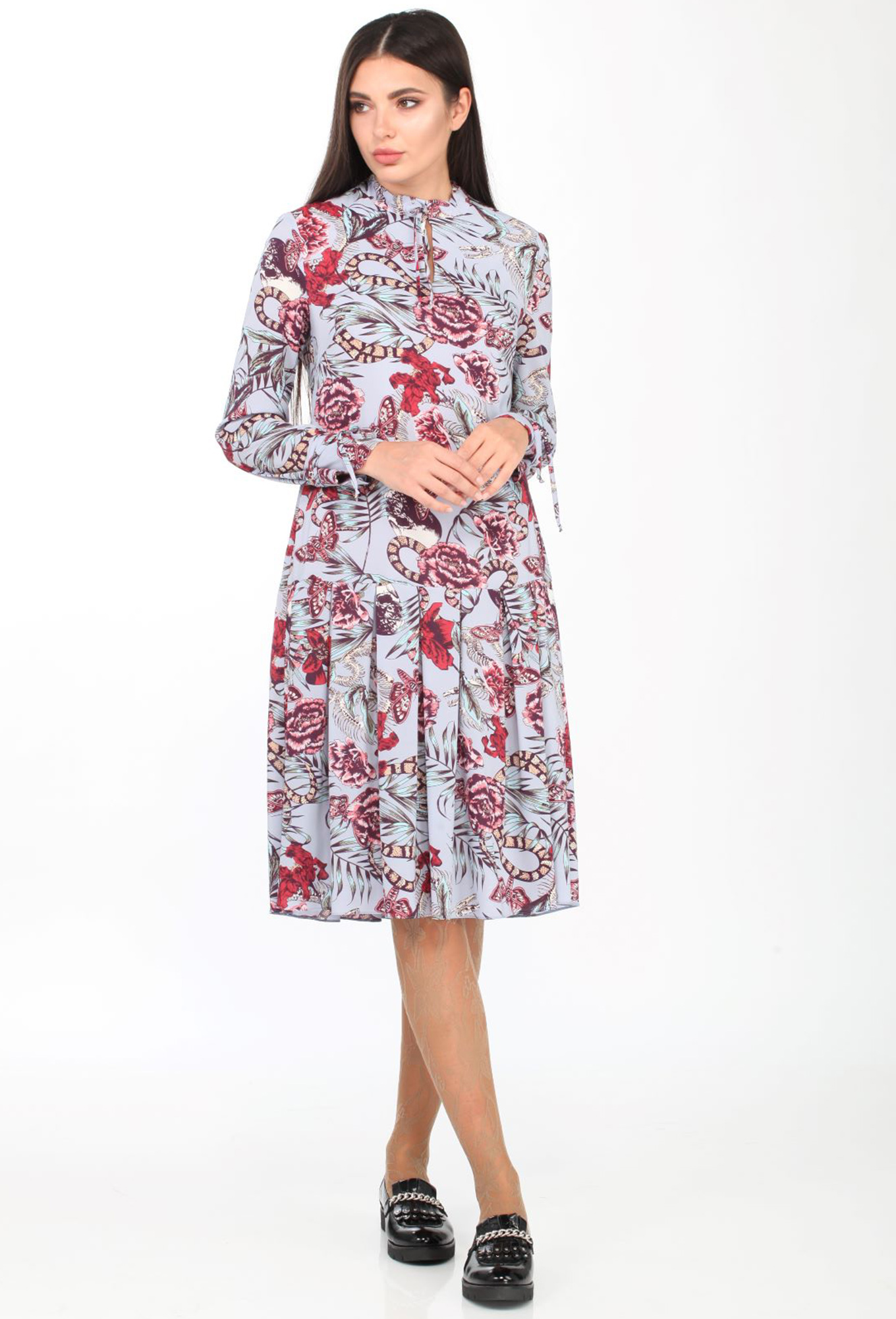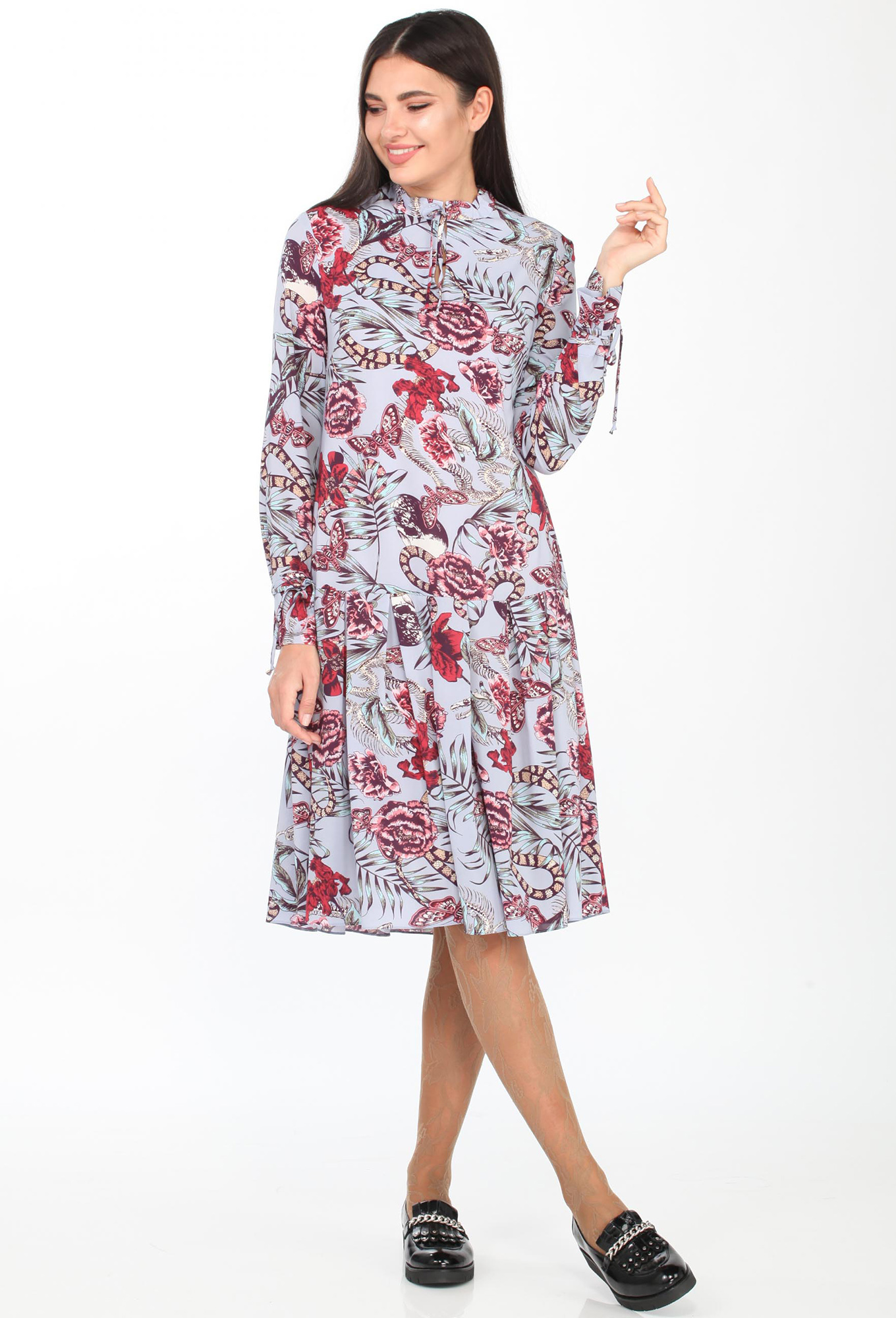 Модель: Эллетто 1718 голубой цветы ..показатьi>Рост: 164 см (девушка на фото 170 см) Сезон: весна-лето Тип ткани: полиэстер 100%Платье женское нарядное, свободного силуэта, длиной ниже линии колен из текстильной ткани с цветочным принтом. Перед с нагрудными вытачками, выходящими из бокового шва. Спинка цельная. Низ платья обработан воланом со встречными складками. Вырез горловины обработан воротником стойкой, по переду переходя в завязку. Рукав втачной, одношовный, длинный по низу обработан швом в подгибку с закрытым срезом. Платье на трикотажной подкладке.
