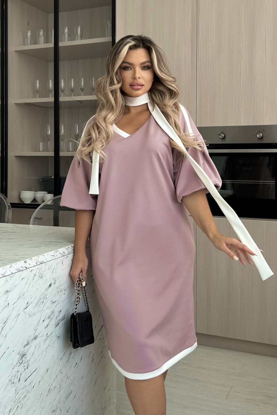 Женственное платье прямого силуэта. V - образная горловина на внутренней обтачке оформлена вставкой. Втачной рукав - фонарик со спущенным плечом. Низ ровный, оформлен притачной манжетой, сзади шлица. Пояс из основного материала входит в комплект.