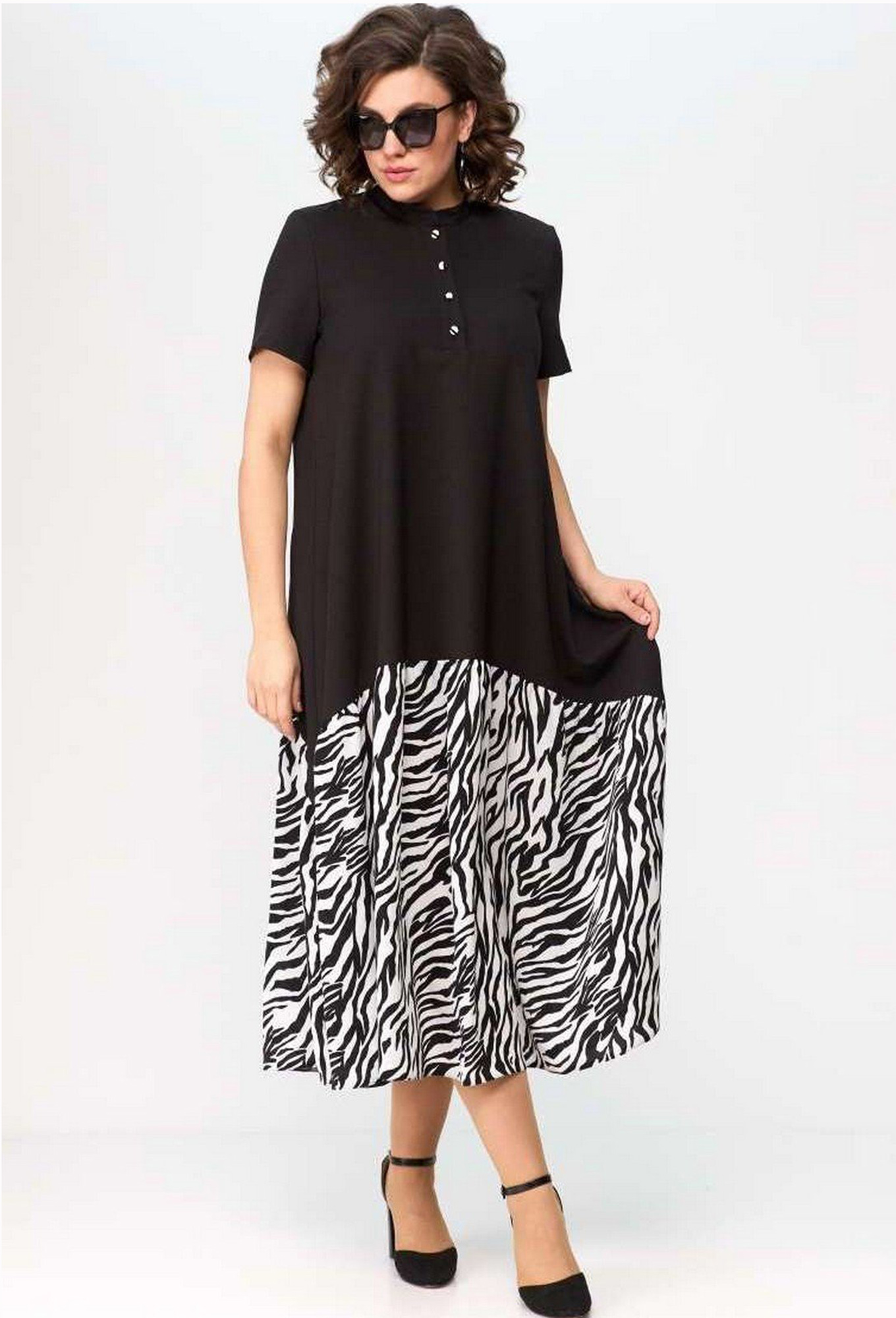 Модель: ЕВА ГРАНТ 7061 чёрный зебра <..показатьli>Рост: 170 см (девушка на фото ростом 170см) Сезон: Весна-Лето Тип ткани: Лен 60%, Вискоза 40%Платье женское нарядно-повседневное свободного силуэта расширенное к низу, выполнено из костюмно-плательной ткани в сочетании с крепом. Вырез горловины стойка с планкой на ометаные петли и обтяжные пуговицы. Рукав втачной короткий. По низу платья фигурный волан из отделочной ткани спринтом "зебра". Декором служит фигурный подрез по низу платья и обтяжные пуговицы по планке платья.