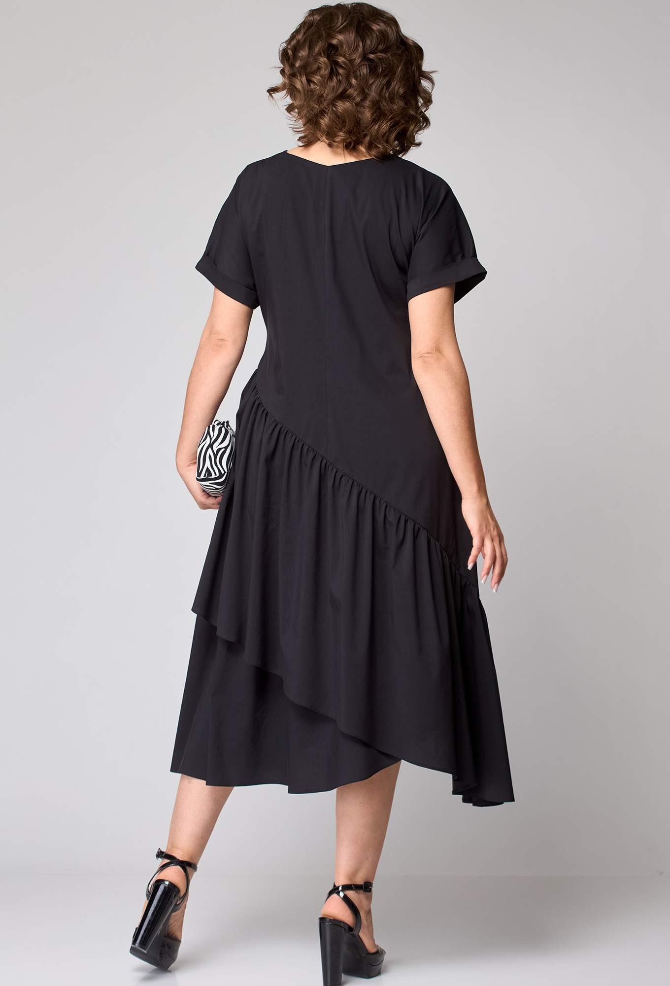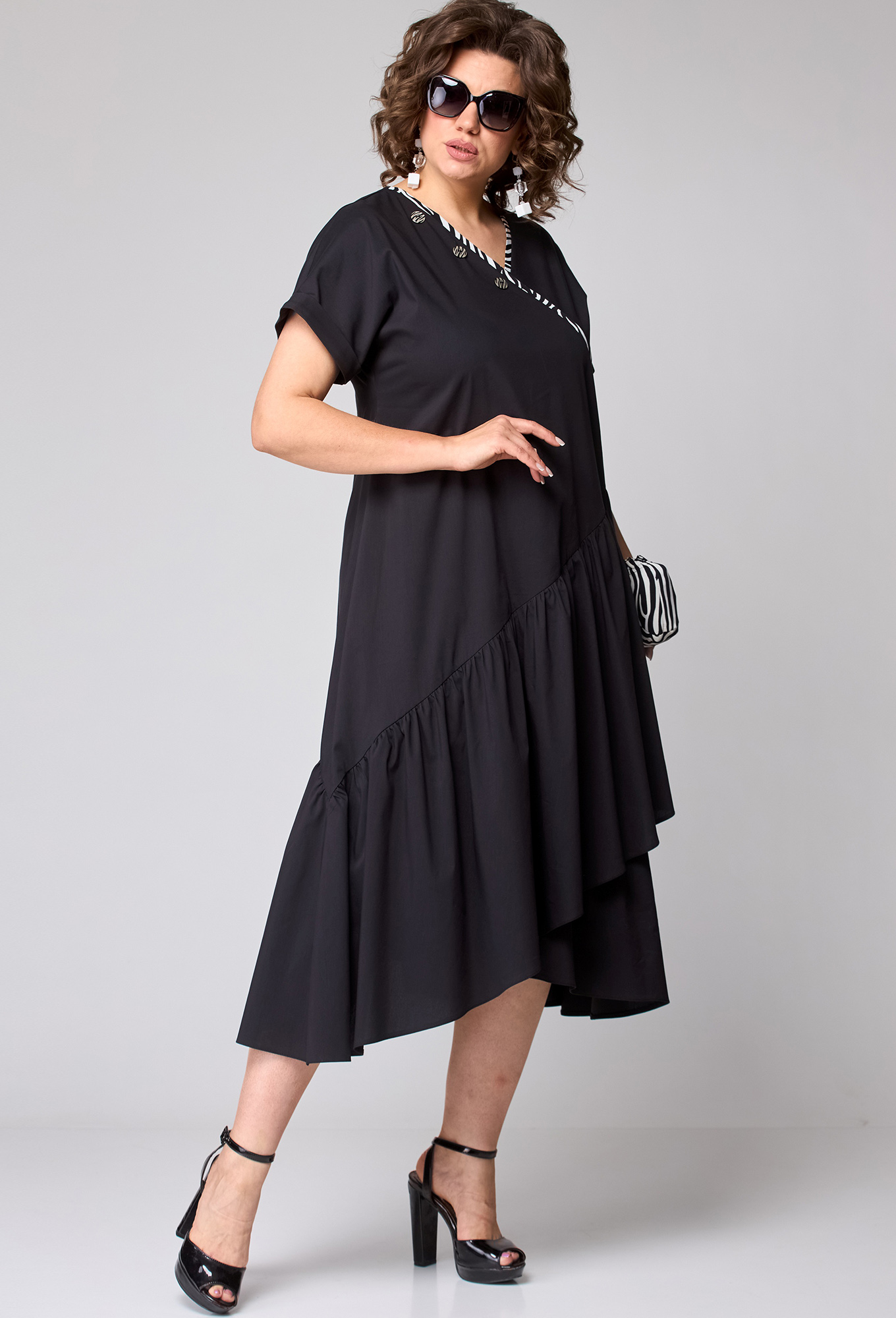 Модель: ЕВА ГРАНТ 7122-1 чёрный Р..показатьост: 170 см (девушка на фото ростом 170см) Сезон: Весна-Лето Тип ткани: Хлопок 71%, полиамид 26%, эластан 3%Платье женское повседневное ,свободного силуэта выполнено из хлопкового полотна. Вырез горловины V- образный , рукав спущенный короткий по низу на притачной манжете закрепленной наверх. По платью асимметричные подрезы с воланами собранными на сборку. Декором платья служит съёмный пояс из основной ткани и отделка горловины с отделочной ткани с анималистическим принтом ( зебра).