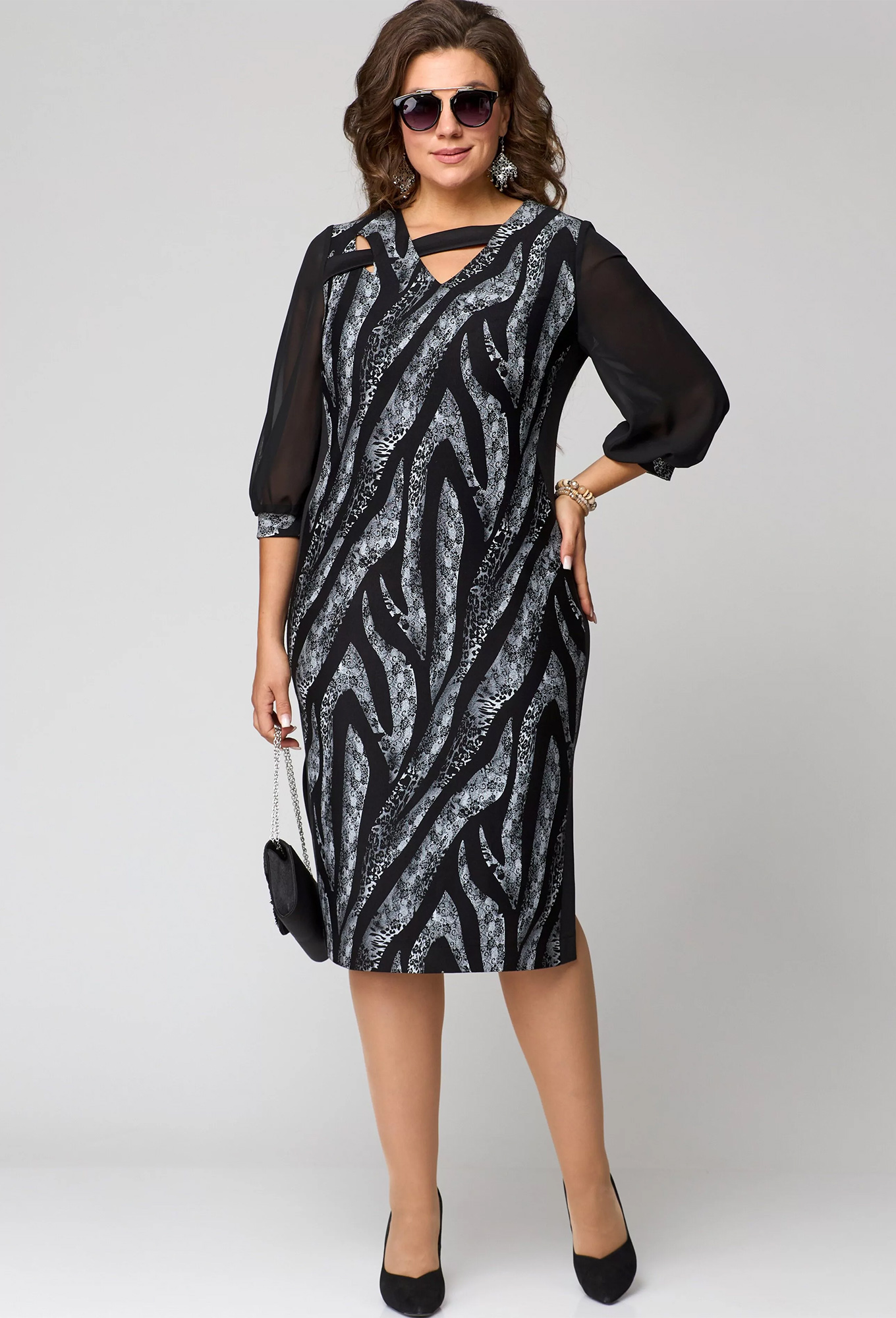 Модель: ЕВА ГРАНТ 7220 черный-серый <..показатьli>Рост: 170 см (девушка на фото ростом 170см) Сезон: Круглогодичный Тип ткани: Вискоза 60%, полиамид 36%, спандекс 4%Платье женское нарядно-повседневное прилегающего силуэта зауженное книзу, выполнено из трикотажного полотна двух дизайнов в сочетании с шифоном. Вырез горловины V-образный обработан обтачкой. Рукав втачной 3/4, по низу со сборкой на притачной манжете. По спинке центральный шов и потайная застежка-молния. В боковых швах обработаны разрезы. декором служит отделочный элемент по полочке платья.