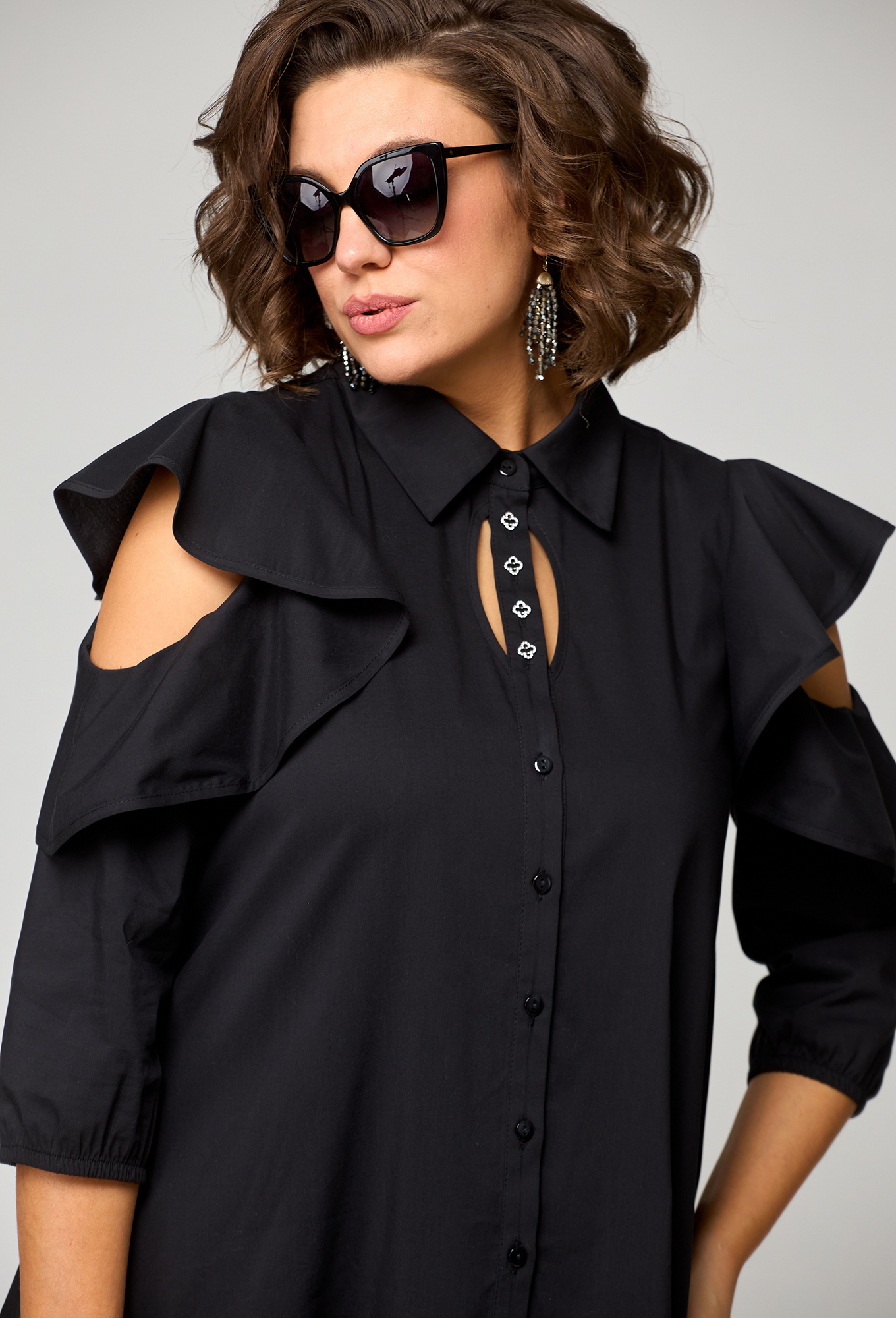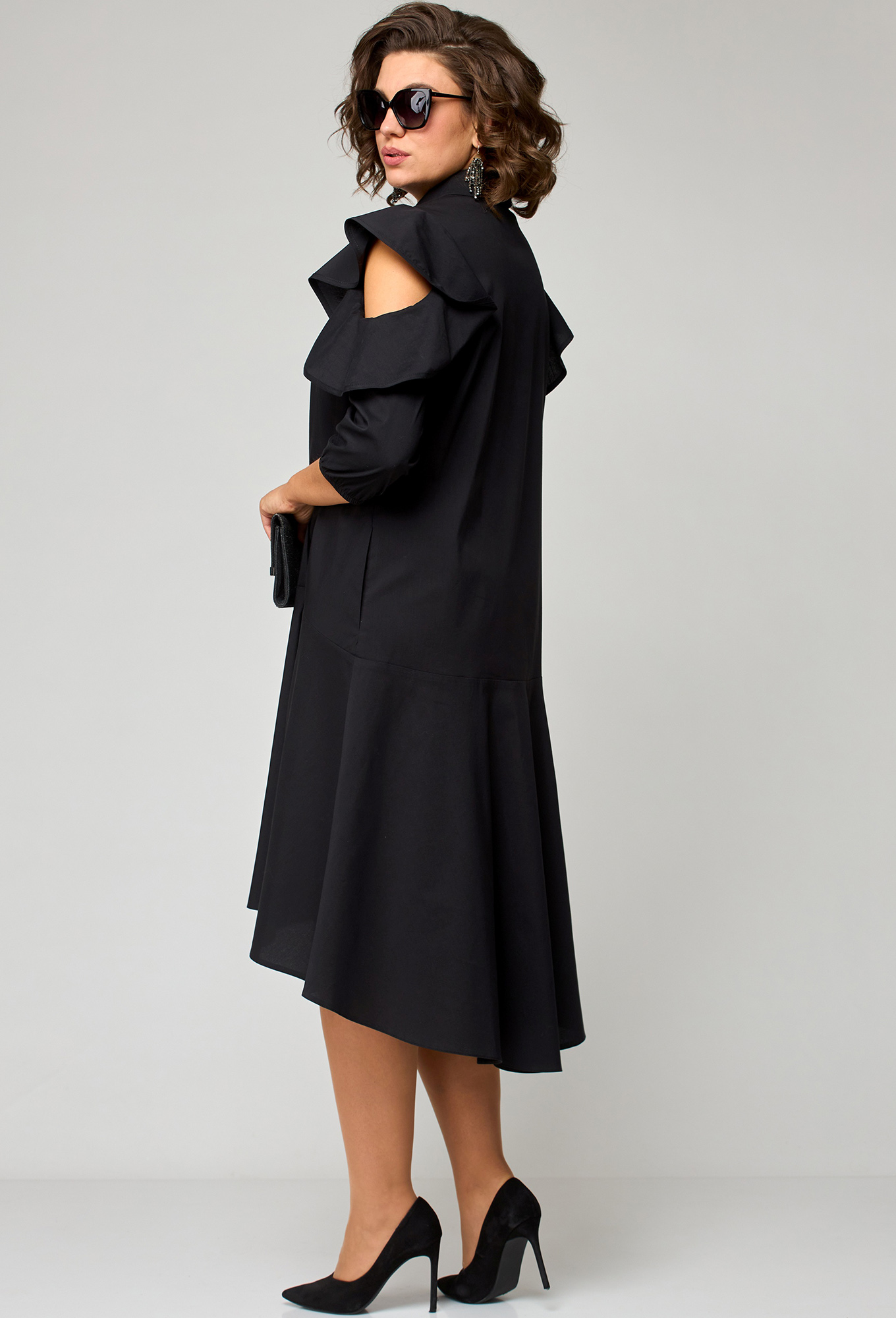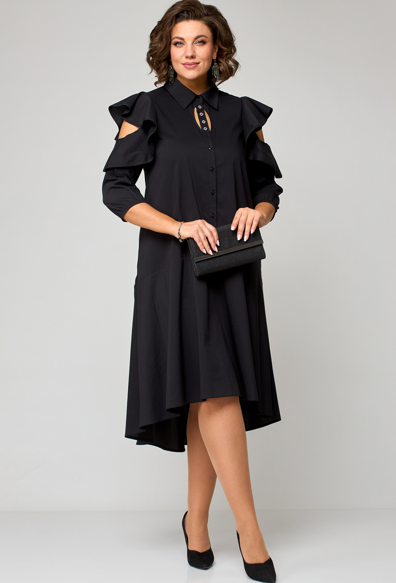 Модель: ЕВА ГРАНТ 7299 чёрный Рос..показатьт: 170 см (девушка на фото ростом 170см) Сезон: Весна-Лето Тип ткани: Хлопок 71%, Полиамид 26%, Эластан 3%Платье женское нарядно-повседневное полуприлегающего силуэта расширенное к низу выполнено из хлопка. Вырез горловины воротник на стойке рубашечного типа. По центру переда планка с отделочным элементом. Рукав втачной "фэнтези" с частично открытым плечом, по низу рукав собран на резинку. Платье по линии бедер отрезное, в боковых швах обработаны карманы. Низ платья фигурный (по спинке длиннее). Декором платья служат рукава и украшенные стразами пуговицы по планке.