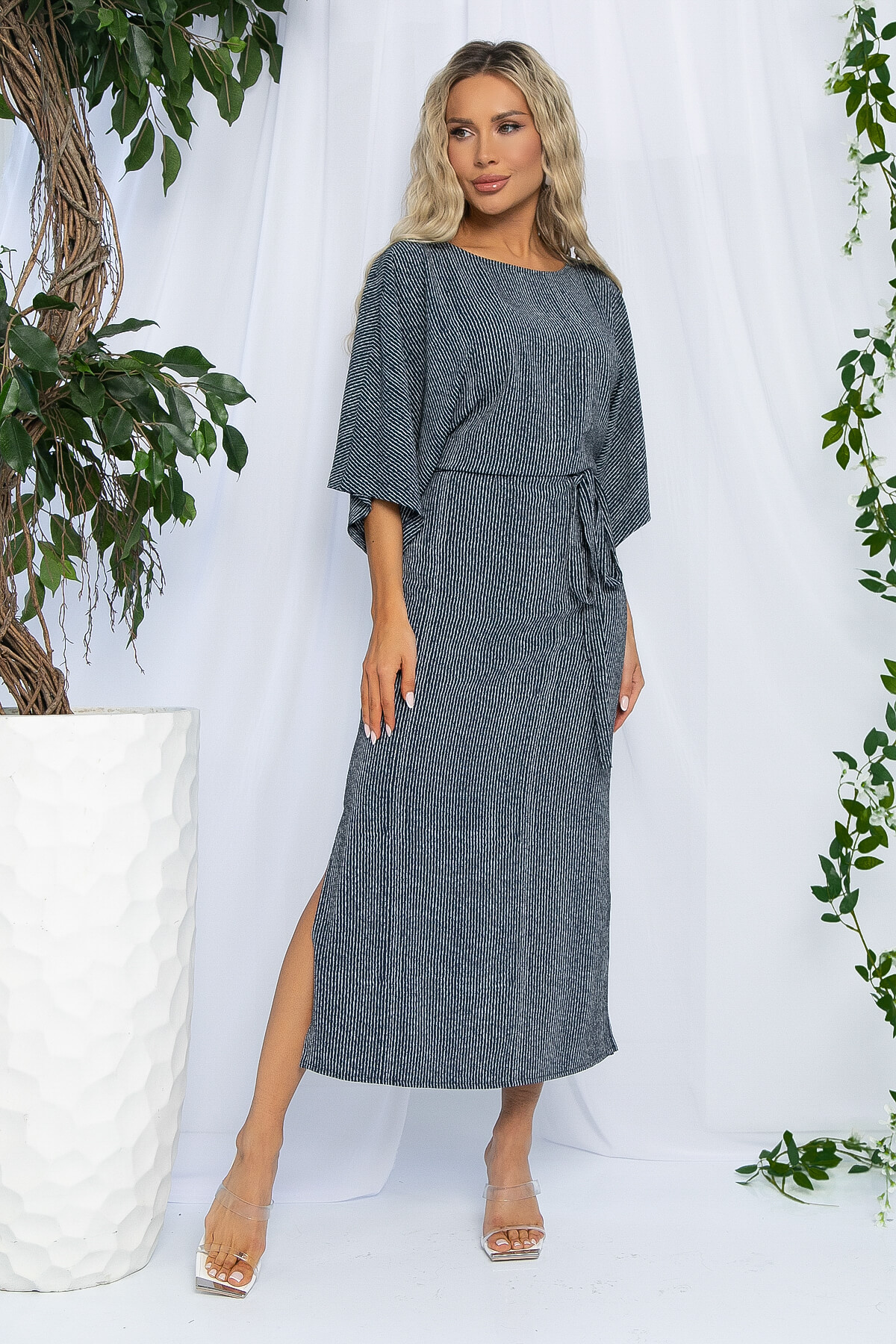 Создайте свой идеальный летний образ с этим платьем! Платье с принтом в полоску и современным кроем станет вашим верным спутником в жаркие дни. Оно не только стильно выглядит, но и обеспечивает комфорт благодаря цельнокроеным спущенным рукавам и разрезам по бокам. Пояс на талии вшитый по бокам, подчеркнет вашу индивидуальность и придаст образу завершенность.
