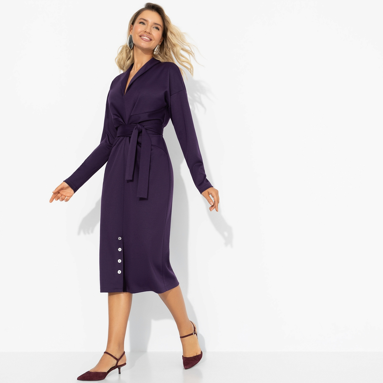 Платье ЧАРУТТИ станет ярким свидетелем его первого признания в любви. Взгляд на тебя изменится навсегда. В нем запечатлеется немое восхищение. Платье можно сохранить как семейную реликвию и рассказывать эту историю потом вашим детям. Платье с лацканами в длине миди приталенного силуэта. Есть пояс в тон основного материала в комплекте. Спущенная линия плеча. Декоративная сборка по центру изделия. Пуговицы внизу платья как декор.
