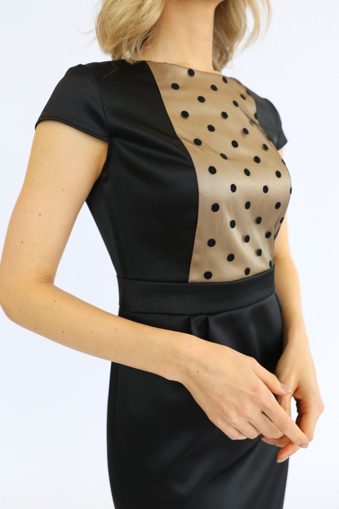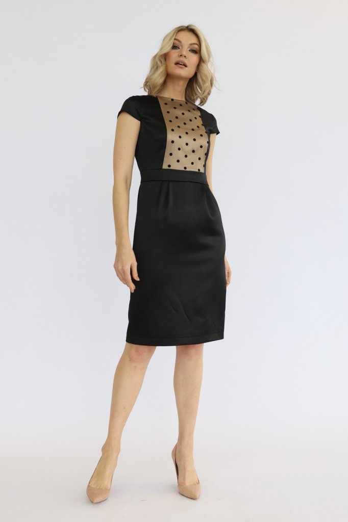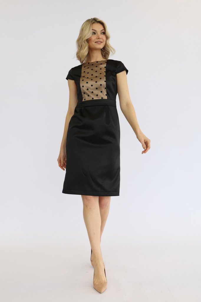 Платье со вставкой-сеткой на груди, отрезное по линии талии, шлица, застежка-молния на спинке.