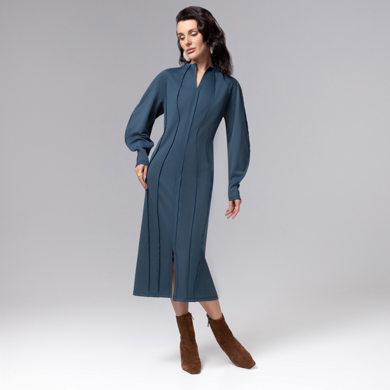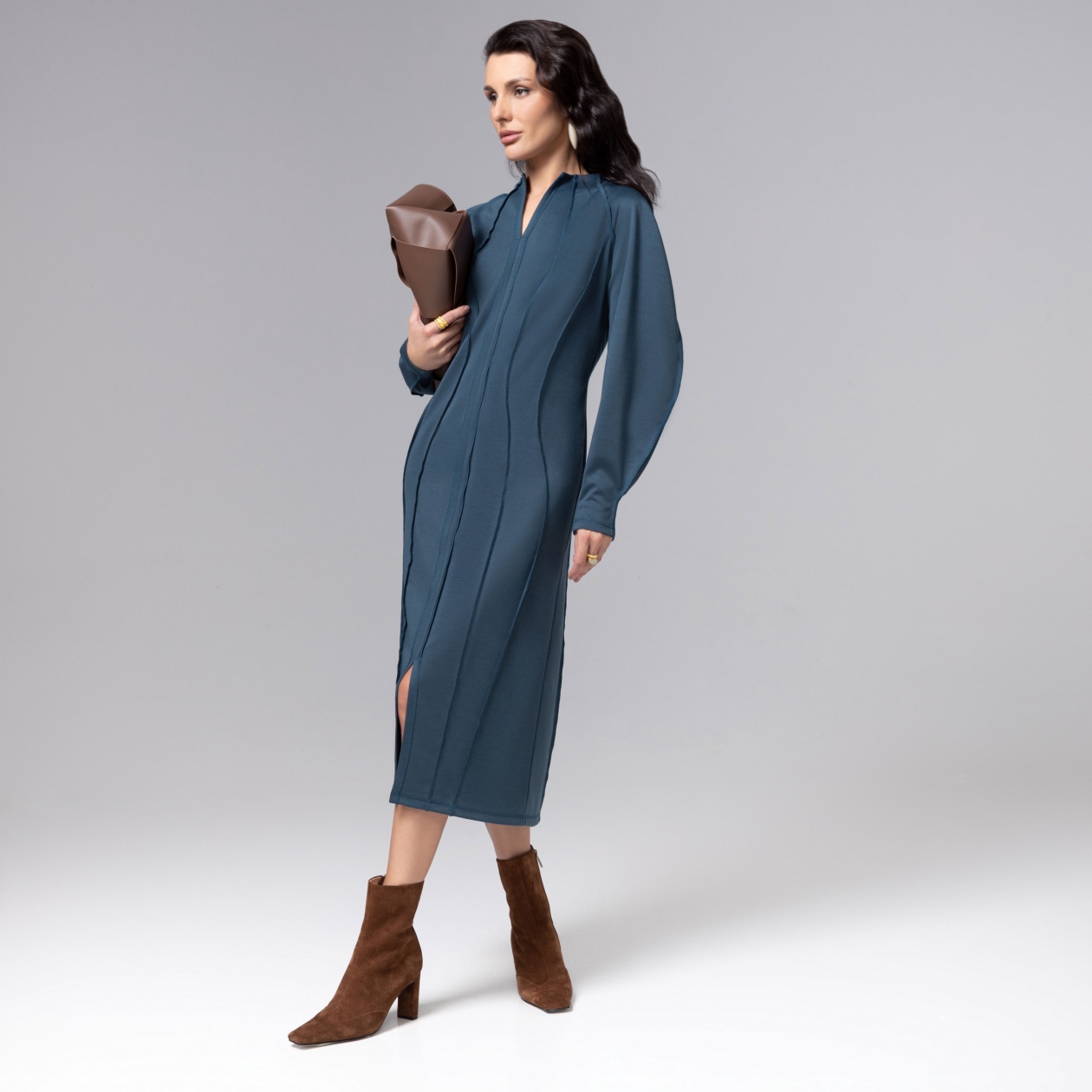 Платье ЧАРУТТИ полуприлегающего силуэта в глубоком оттенке цвета морской волны олицетворяет собой гармонию современной элегантности и виртуозного кроя. Выразительные внешние швы не только моделируют изящный силуэт, но и выступают в роли стильного декоративного элемента. Безупречный пошив проявляется в ювелирной точности лекал, безукоризненном соединении деталей и использовании передовых технологий, обеспечивающих комфорт и идеальную посадку. Ошибка при загрузке данных! (https://charutti.ru/upload/video-site/00000012169_video_site.mp4)