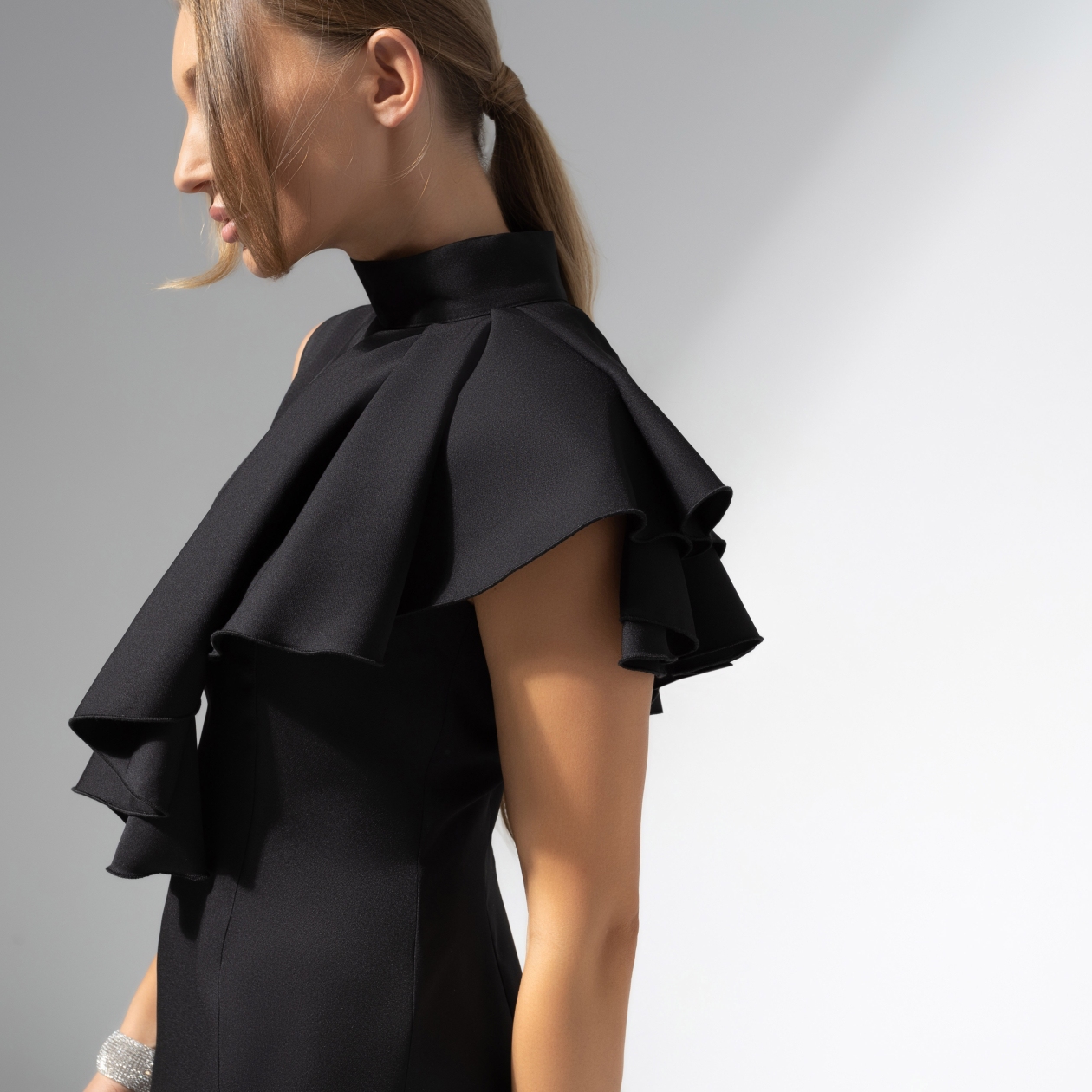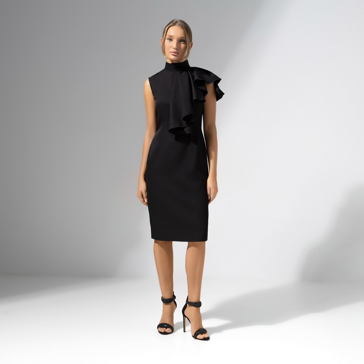Твое повышение до должности мечты еще не случилось, но платье для празднования этого события выбрано. Именно в элегантном образе CHARUTTI ты будешь благодарить руководителя и коллег и поднимать бокал за плодотворное сотрудничество. Платье по фигуре в длине миди. Асимметричный объемный съемный декор. Воротник-стойка. Платье застегивается на скрытую молнию по спинке. Есть деликатный разрез.
