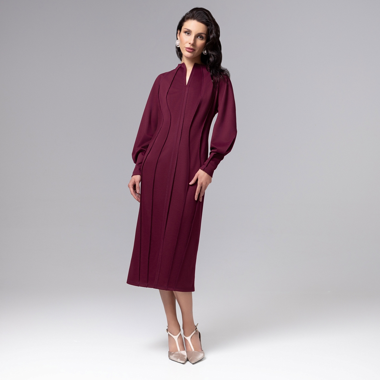 Платье коллекции PREMIUM полуприлегающего силуэта в роскошном цвете бордо воплощает современную элегантность с акцентом на безупречную конструкцию. Трендовые внешние швы не только подчеркивают изящные линии фигуры, но и выступают художественным элементом, добавляя образу выразительности. Идеальный пошив проявляется в точном соблюдении пропорций, безукоризненной стыковке деталей и использовании технологии, обеспечивающей идеальную посадку без скованности движений.