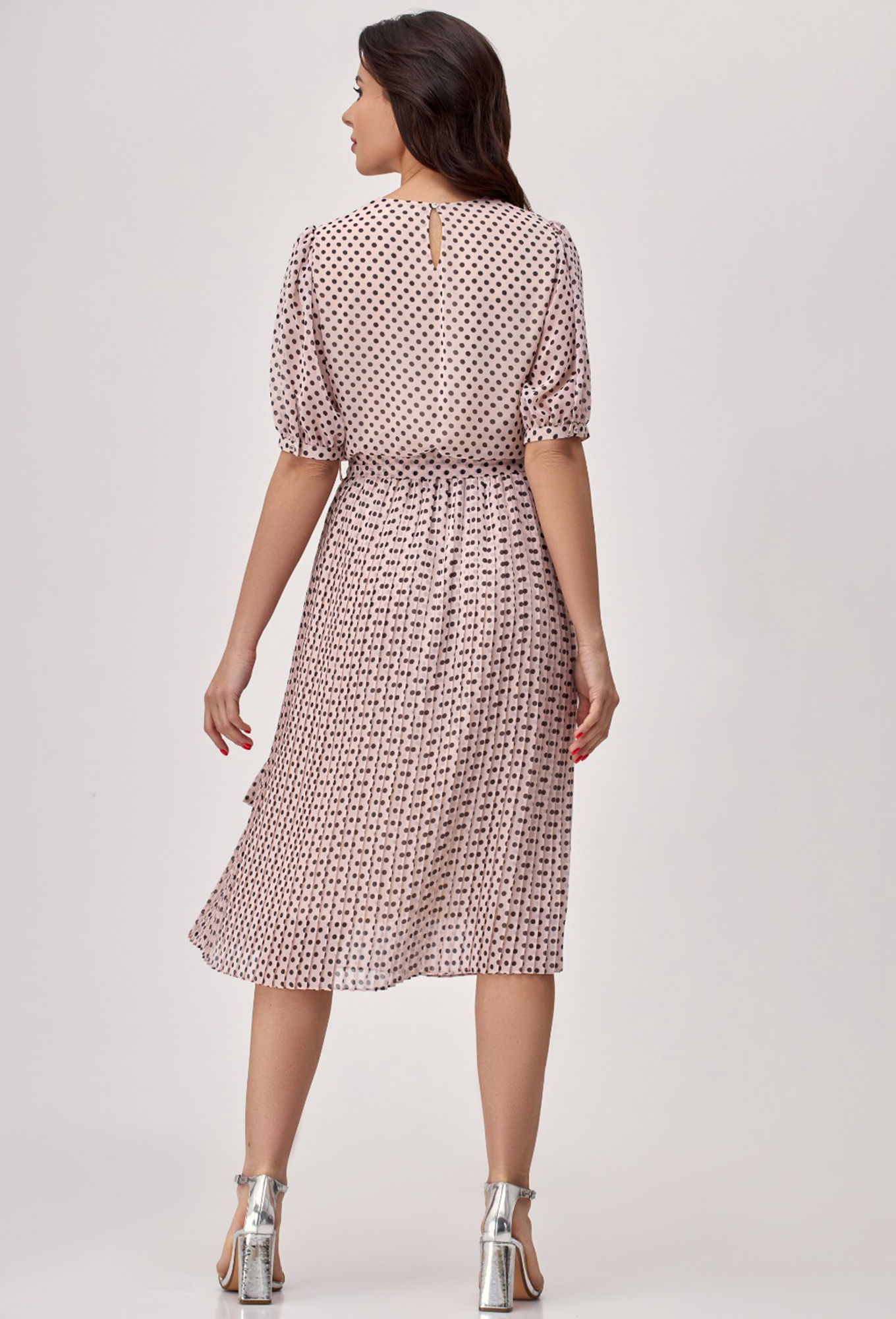 Модель: Гизарт 5115 бежевый-горох ..показать>Рост: 164 см (девушка на фото ростом 170см) Сезон: Весна-Лето Тип ткани: Полиэстер 100%Платье прямого силуэта, отрезное по линии талии и приталенное с помощью резиночки, с юбкой плиссе. Перед с нагрудной вытачкой. В боковых швах шлевки. Горловина круглая, по спинке застежка капелька на одну петлю-пуговку. Рукав втачной со сборкой по окату и по низу с притачной манжетой с застежкой на одну петлю- пуговку. Платье на подкладке. Платье дополнено поясом из основной ткани.