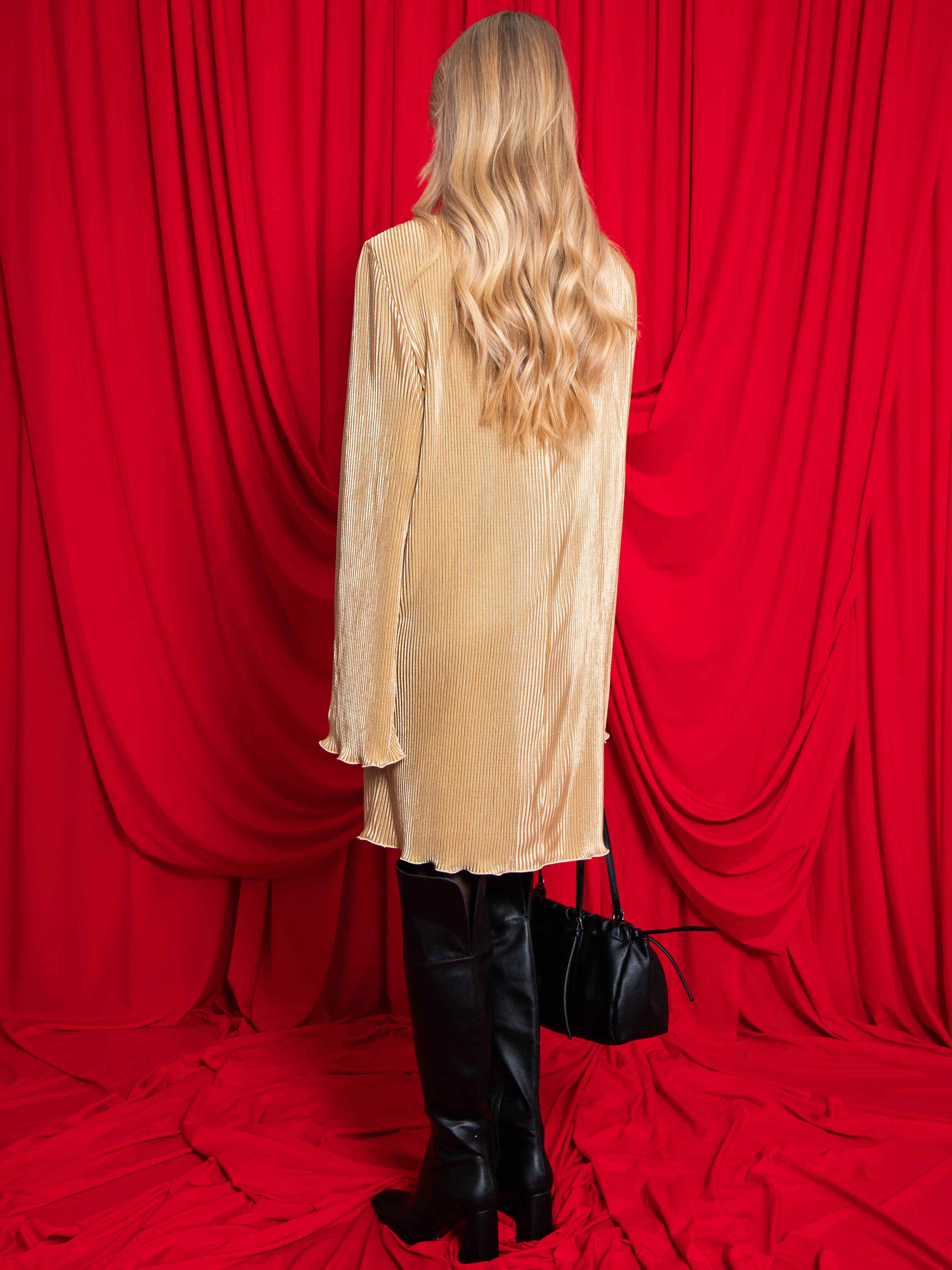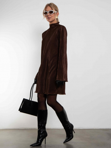 Платье свободного силуэта и гофрированного плательного трикотажа. Модель имеет длинный втачной рукав. Надевайте ремень по верх платья и будьте в духе Burberry.
