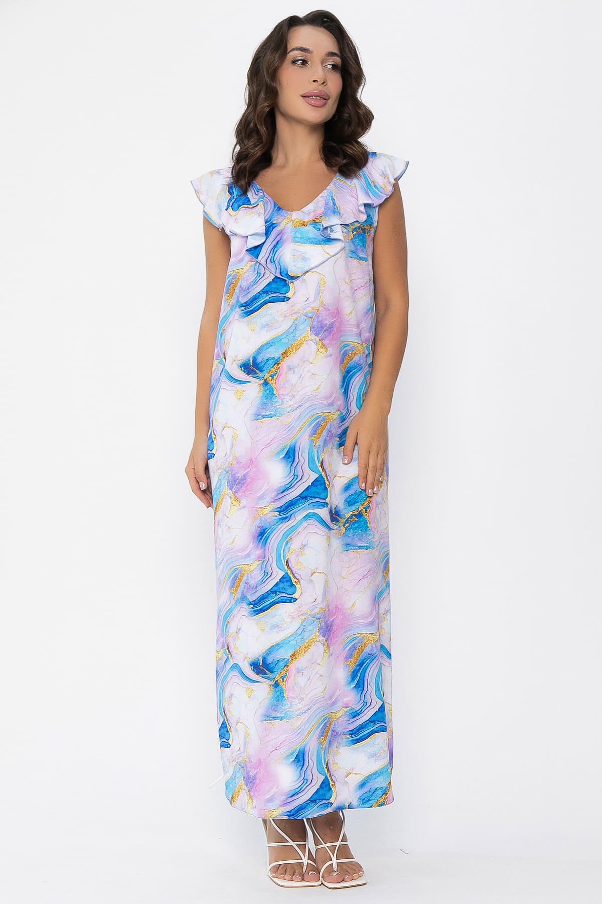 Яркое и эффектное платье в красивом голубо-розовом цвете с выразительным принтом подчеркнёт вашу утончённость и изысканность! Прямой силуэт с закруглёнными боковыми частями, переходящими в стильные боковые разрезы. V-образная горловина как спереди, так и сзади, украшенная нежным воланом. В комплекте идет пояс из основной ткани, который подчеркивает талию. Идеально подойдёт для повседневных выходов в город, отдыхов на пляже и прогулках вдоль моря. Почувствуйте себя уверенно и стильно! Это платье создано именно для вас!