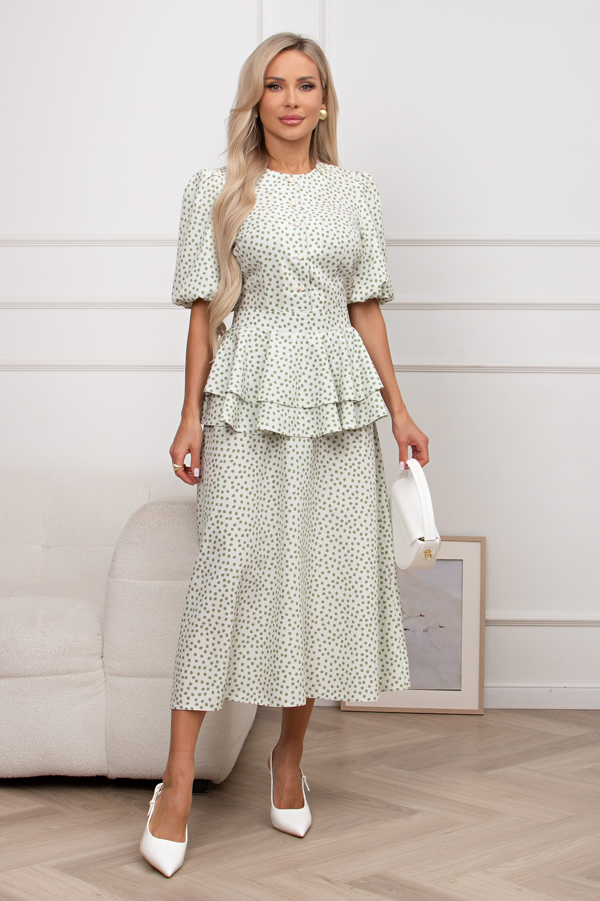 Романтичное летнее платье со съемной баской изготовлено из текстильного полотна. Округлая горловина на внутренней обтачке переходящая в планку с застежкой на петли и пуговицы. Втачной рукав - фонарик на подкладке. Модель обрезная по линии талии. В среднем шве спинки застежка на потайную молнию. Низ ровный,без разрезов.