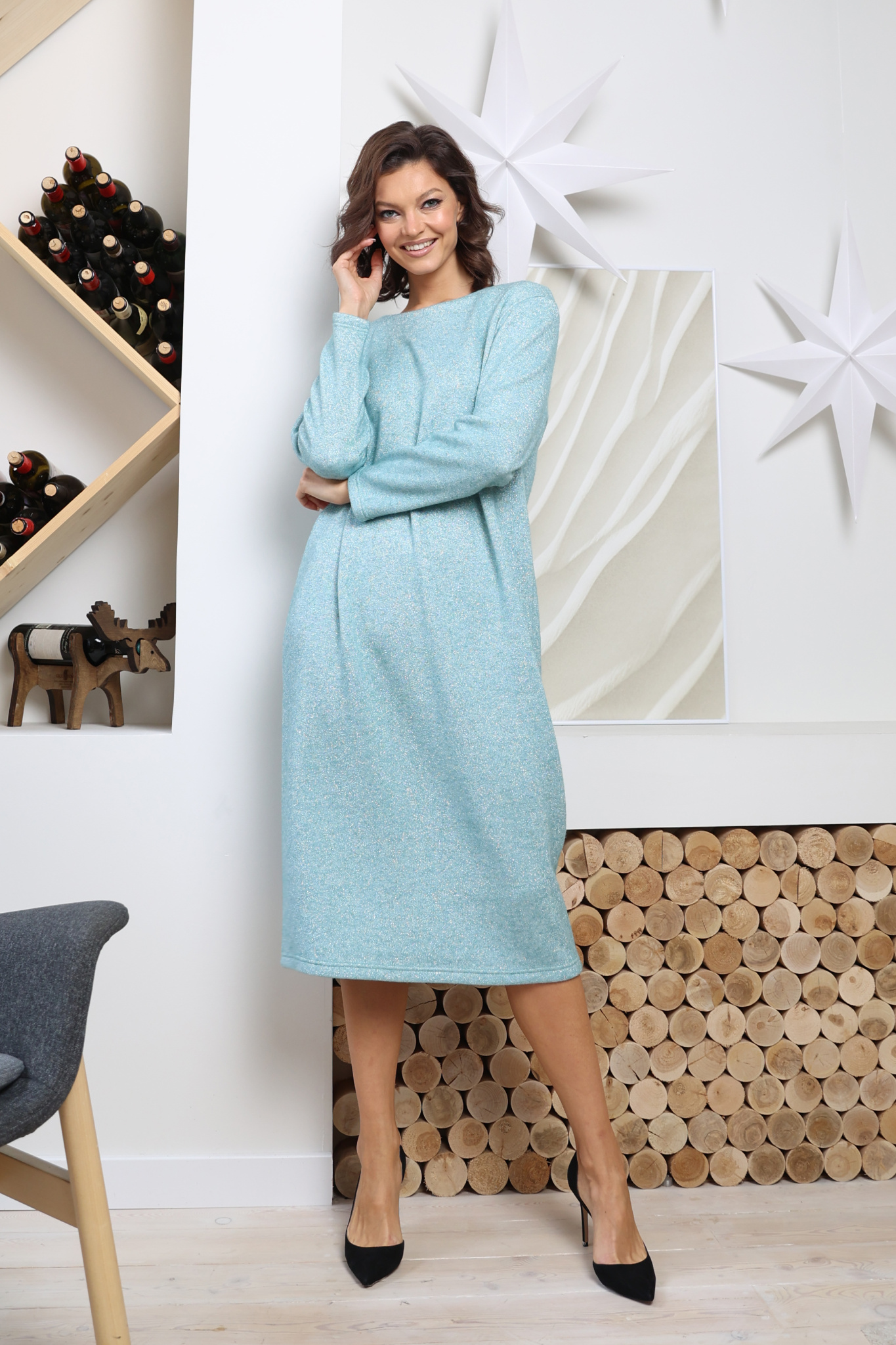 Платье миди свободного кроя. Длинный рукав. Платье выполнено без застёжки. Пояс в комплекте.