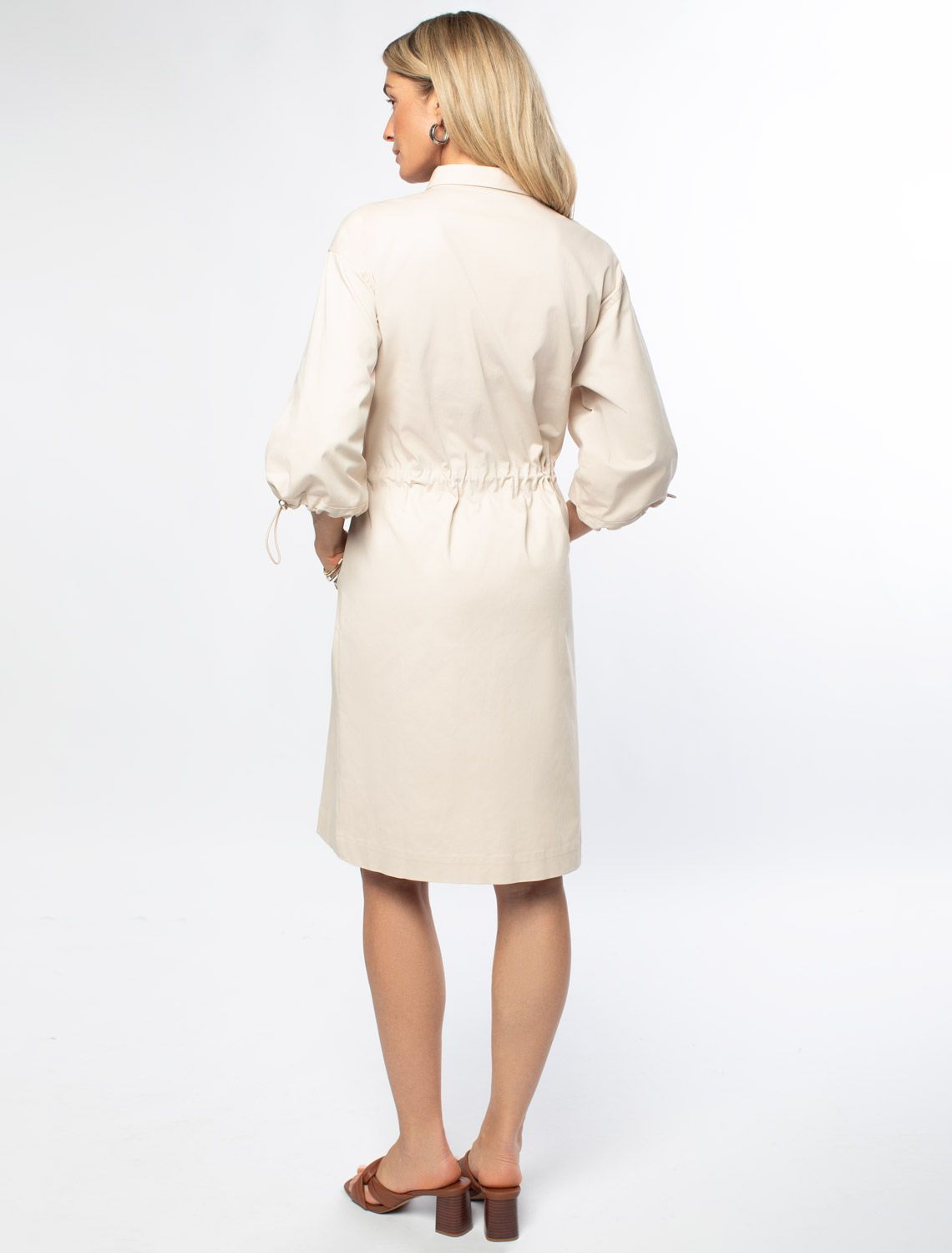 Платье в стиле сафари выполнено из хлопкового твила. Посадка и объем рукава регулируются с помощью металлических стоперов. Модель дополнена боковыми карманами и золотистой застежкой на молнию. Благодаря наличию эластана в составе изделие сохранит свой безупречный внешний вид в течение долгого времени. Обладает высокой воздухопроницаемостью, в платье будет комфортно даже в жаркое время года.