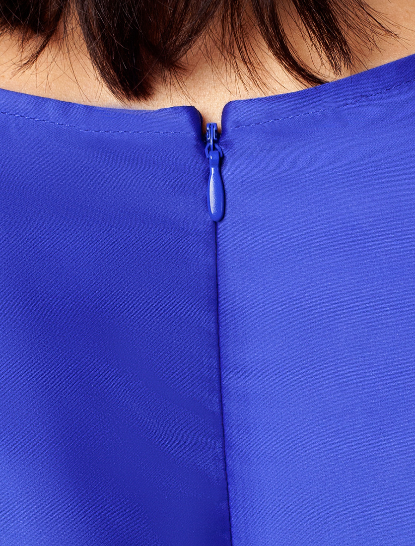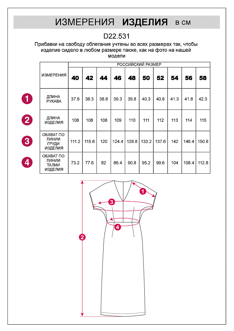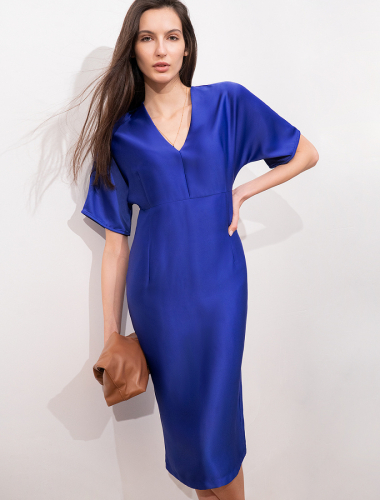 Платье с глубоким V-вырезом и рукавом «летучая мышь» выполнено из тончайших нитей плотного сатина, плетение которых создает полуматовый блеск, напоминающий натуральный шёлк. Модель с длинными глубокими вытачками спереди и сзади выглядит скульптурно, но за счет струящейся ткани сохраняется плавность силуэта. Ткань почти не мнется и имеет легкий вес. Комфортная длина ниже колена и застежка на молнию.