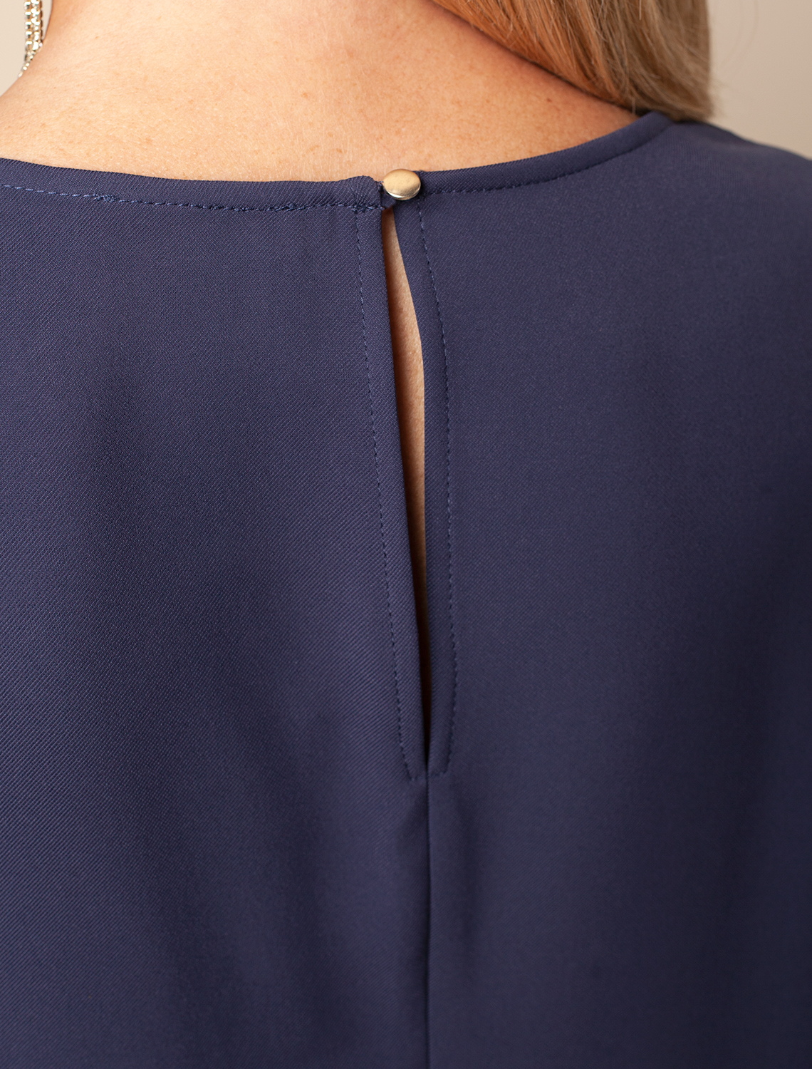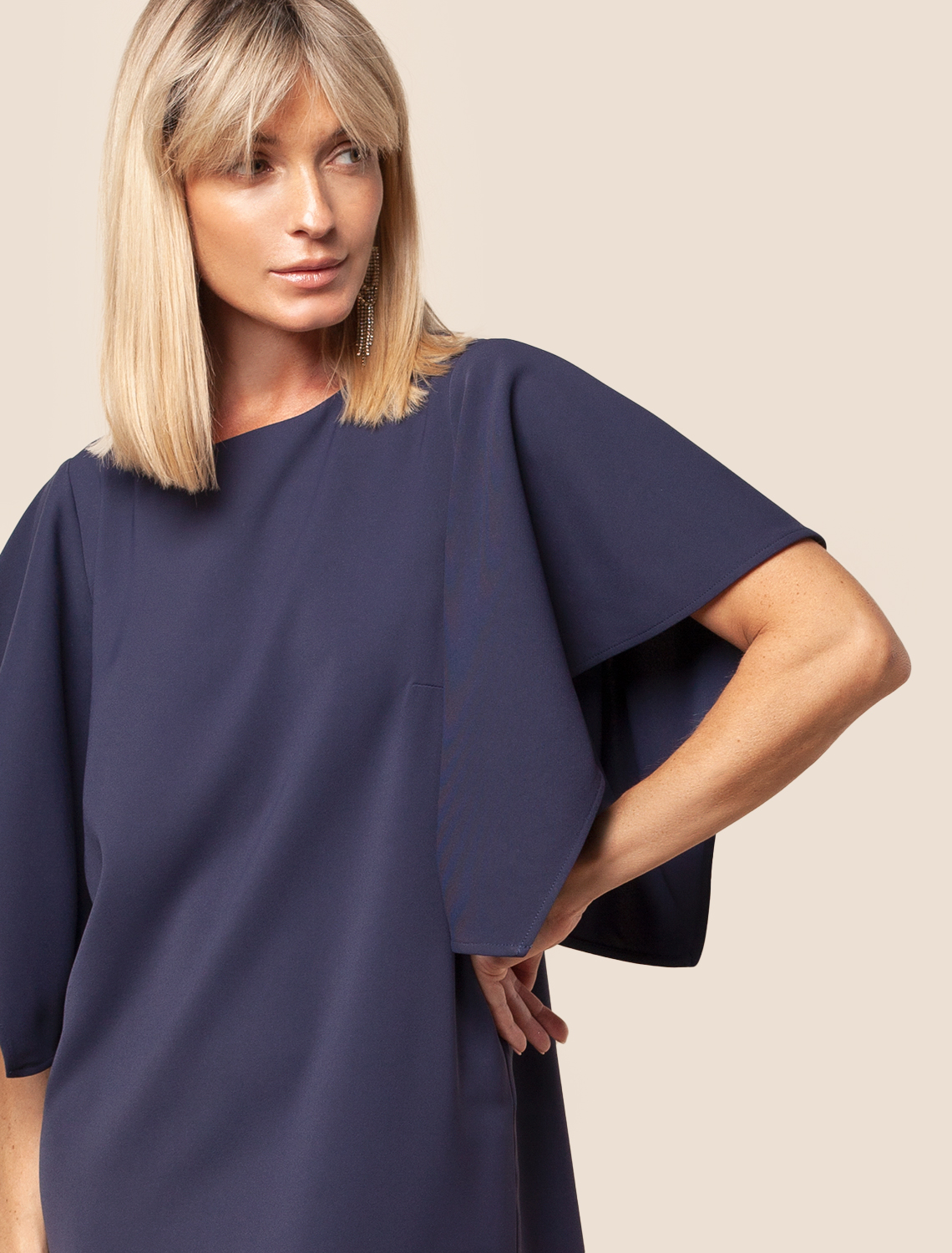 Платье из плотного струящегося крепа прямого кроя с «парящими» рукавами. Фасон платья сбалансирует любой тип фигуры: прямой свободный крой, универсальная длина подола – чуть ниже колена, широкая пройма и акцентные рукава. Классический О-образный вырез фиксируется сзади изящной золотой пуговицей. Материал почти не мнется и комфортен в носке.