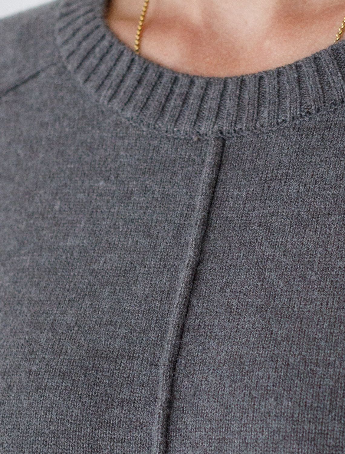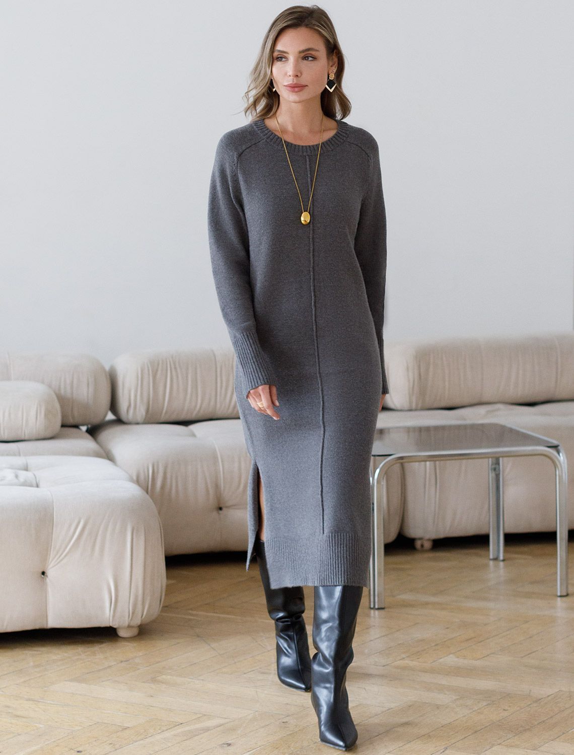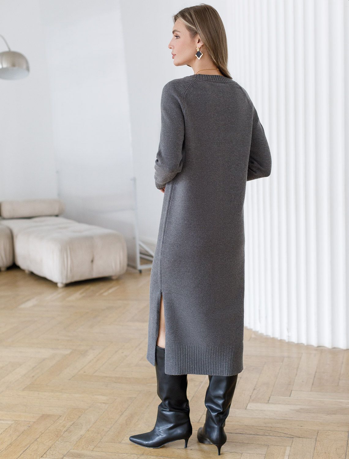 Платье длины миди выполнено из мягкой меланжевой пряжи с кашемиром. Модель прямого силуэта дополнена двумя высокими боковыми разрезами. Вязаный кант вертикально проходящий по всему изделию, визуально стройнит и вытягивает силуэт. При желании можно подчеркнуть линию талии, используя контрастный пояс.