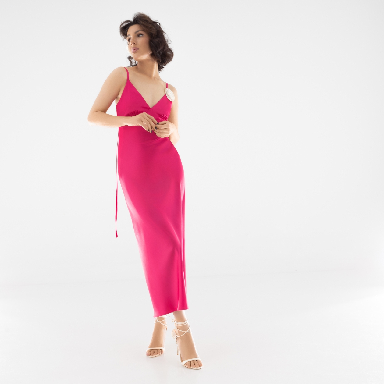 В создании яркого вечернего образа приталенному платью на тонких бретелях нет равных. Насыщенный ягодный цвет, лаконичный крой и шелк «армани» создают стойкое ощущение гармонии. Модель сшита из искусственного шелка высочайшего качества, который практически не ощущается на теле. Платье-комбинация в длине миди. Глубокий вырез зоны декольте. Удлиненные завязки от линии бретелей.