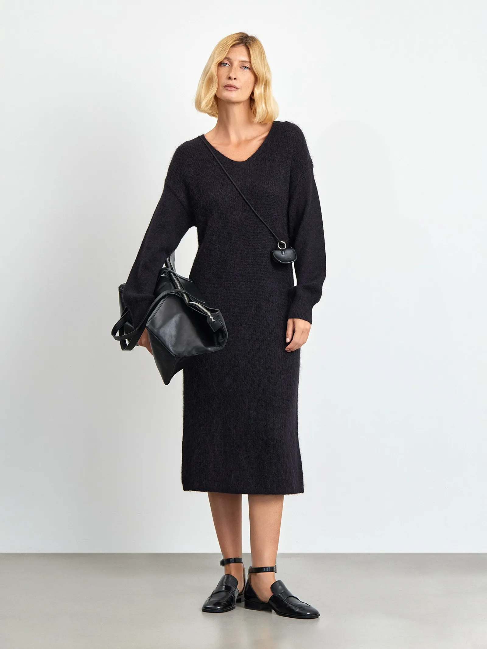 Тихая роскошь на каждый день. Это мягкое вязаное платье более чем наполовину состоит из шерсти альпаки. Модель прямого кроя имеет оптимальную длину чуть ниже колена: идеально для холодного сезона. Рукава также имеют комфорную длину и удобные облегающие манжеты, вывязанные резинкой. Смягчённый V-образный вырез небольшой глубины уместен в любой ситуации, хорошо смотрится на разных типах фигур. Универсальный и самодостаточный чёрный цвет в соединении с дорогой фактурой заявят о вашем хорошем вкусе. Платье станет универсальным вариантом для работы или особых случаев. Остаётся только дополнить его соответствующими аксессуарами.