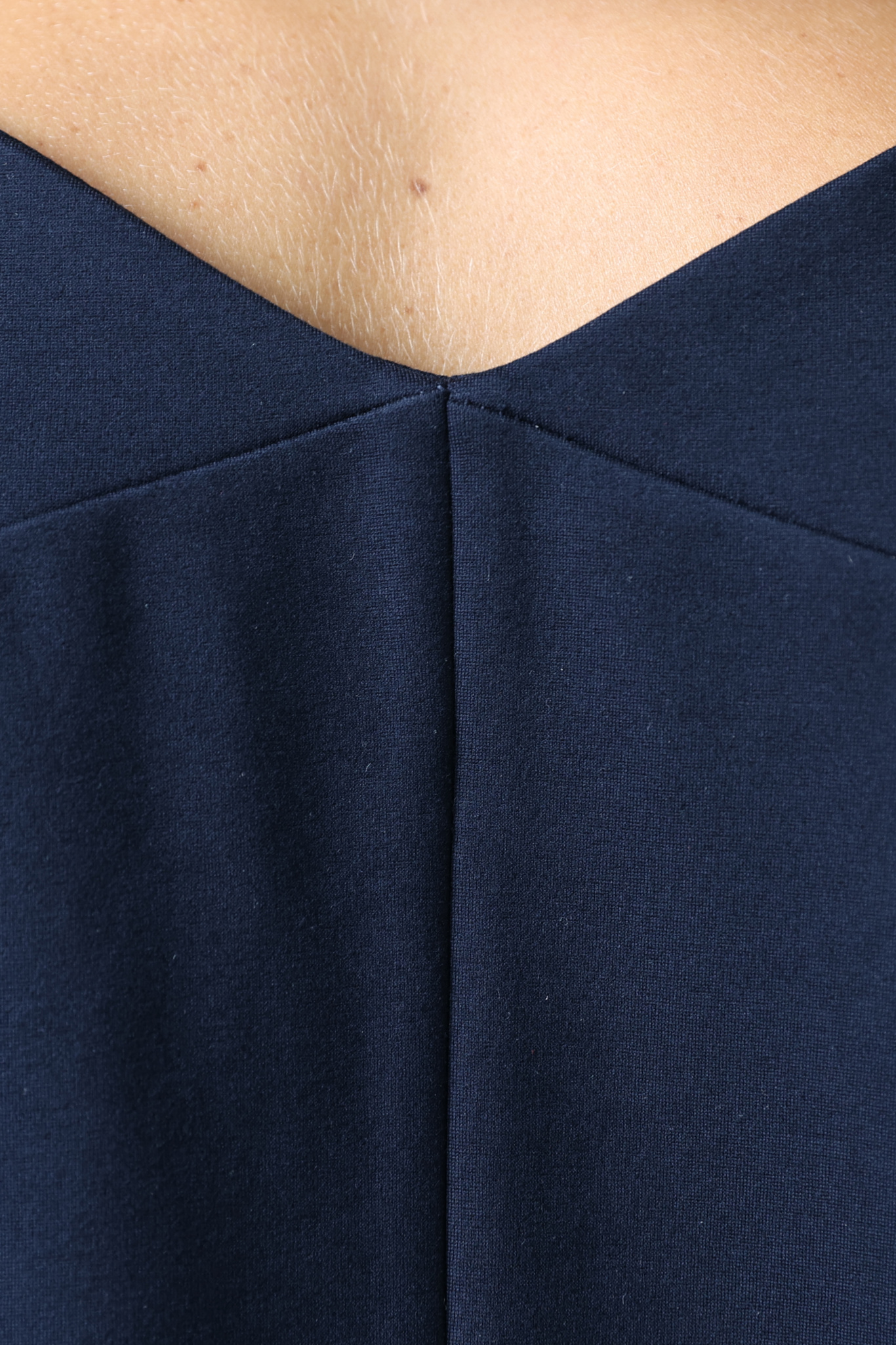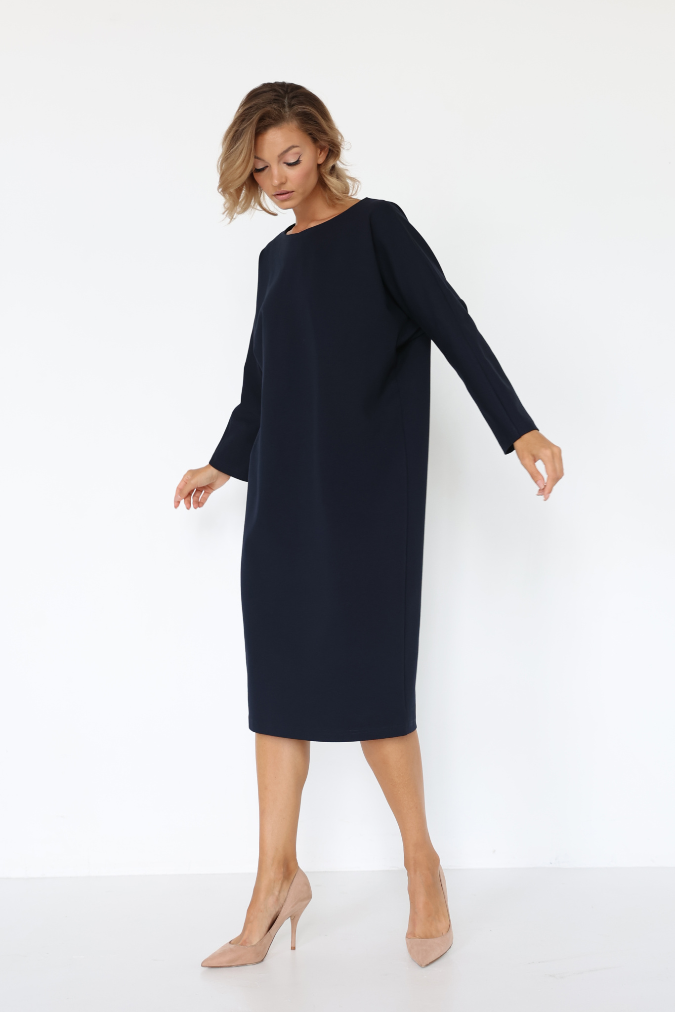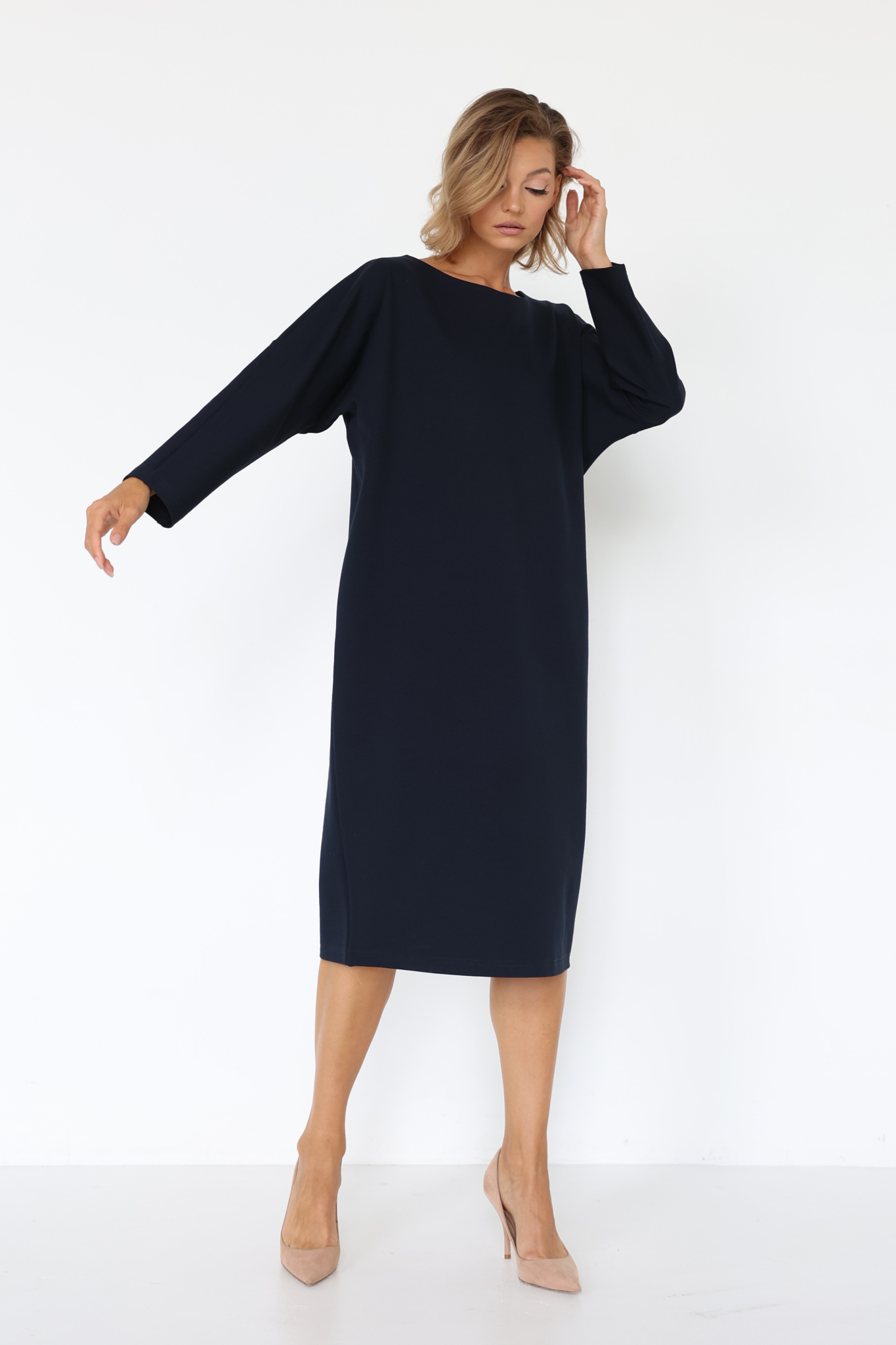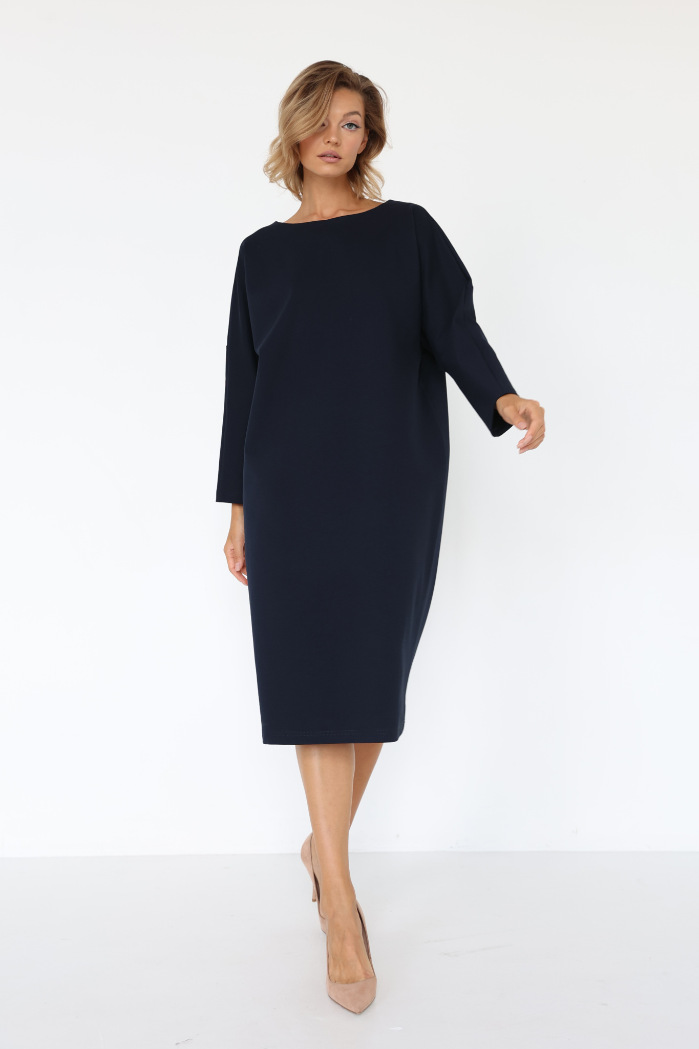 Платье миди свободного кроя со спущенным плечевым швом. V-образная форма горловины по спинке.
