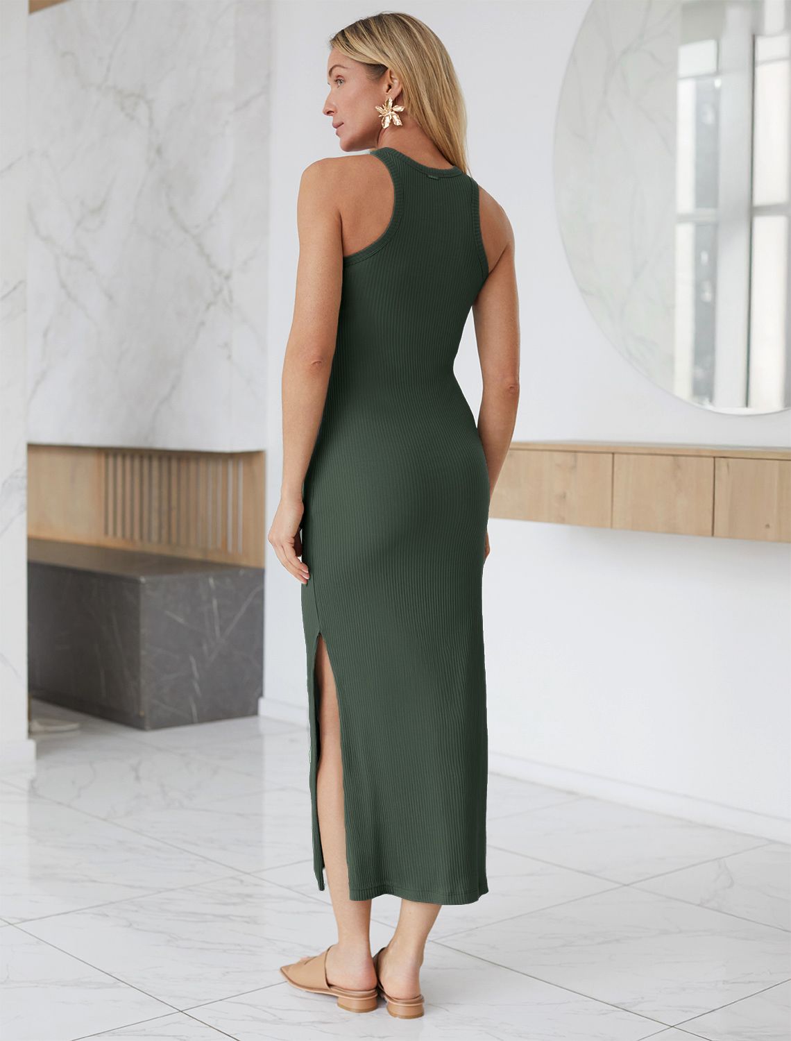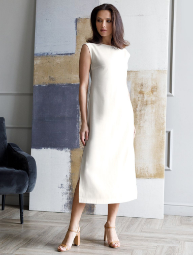 Платье выполнено из трикотажа в широкий рубчик. Модель дополнена высоким разрезом сбоку. Эластичный хлопковый трикотаж идеально сидит по фигуре, не сковывает движений и очень комфортный в носке. Фактура вертикальных полос визуально стройнит и вытягивает силуэт. Изделие хорошо впишется как в повседневный гардероб, так и для вечерних аутфитов.