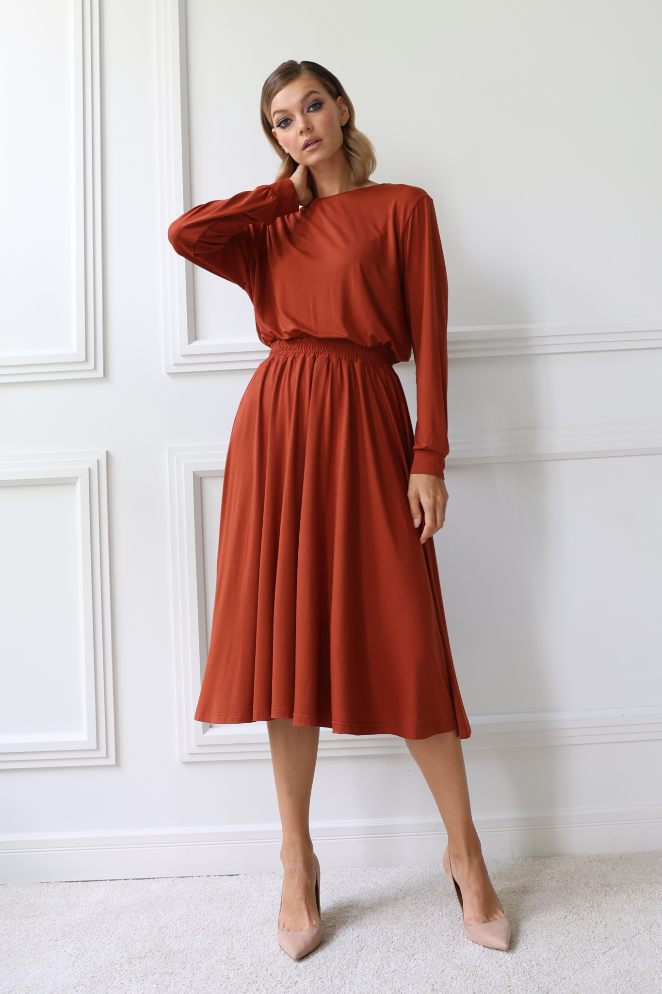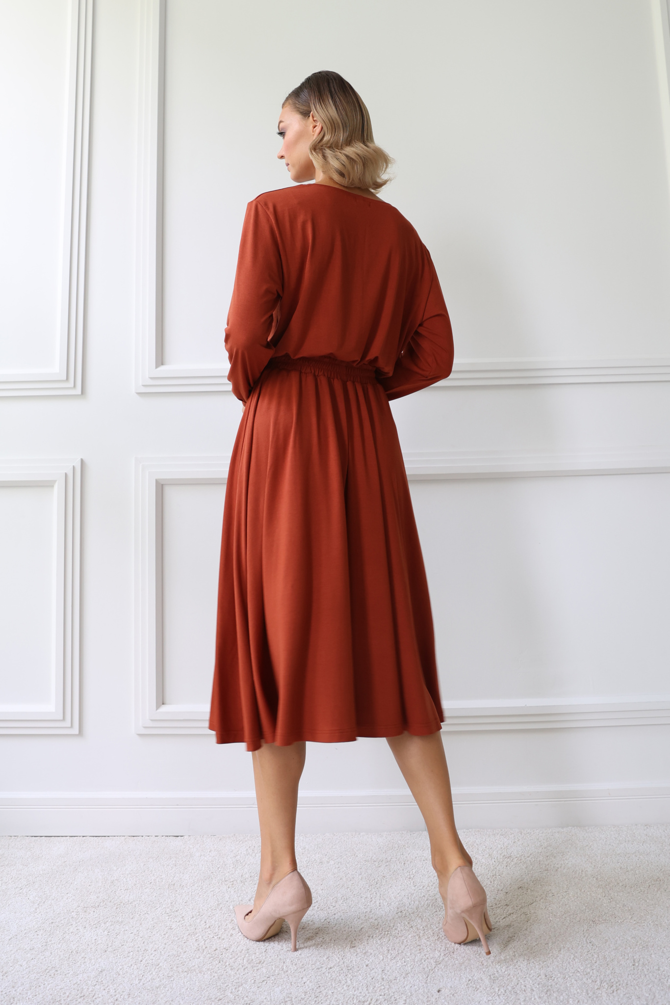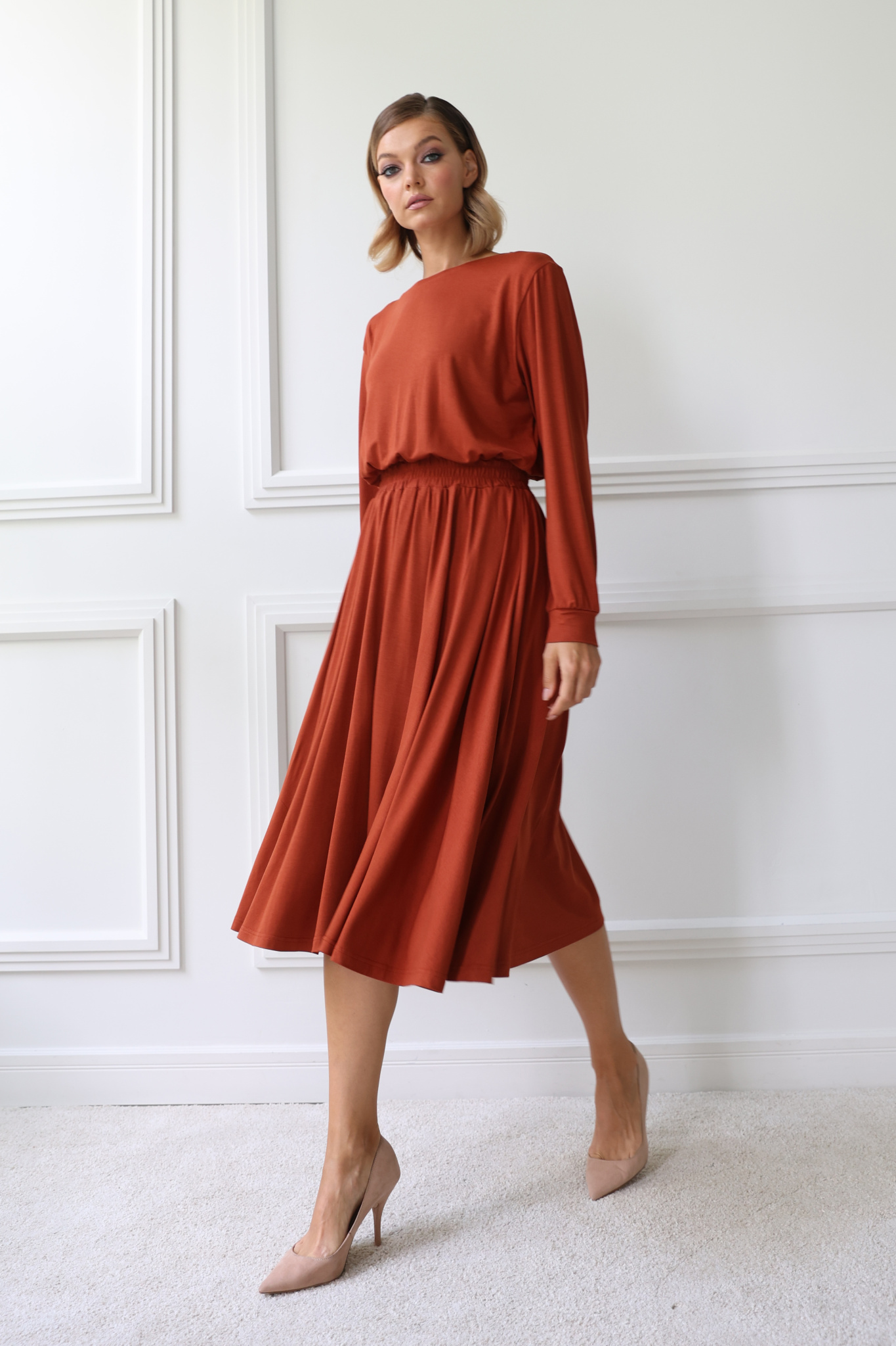 Платье миди с юбкой полусолнце. Длинный рукав на манжете. Широкая кулиска по линии талии.