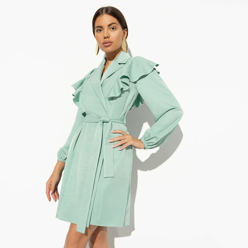 Платье прямого силуэта на запах, с поясом в комплекте, создаёт утончённый и элегантный образ. Рукава с резинкой добавляют комфорта и оригинальности дизайну. Нежный мятный цвет — тренд сезона, который высоко ценится за свою универсальность и стильность. Это платье станет хитом продаж в вашем магазине и привлечёт множество новых клиентов.