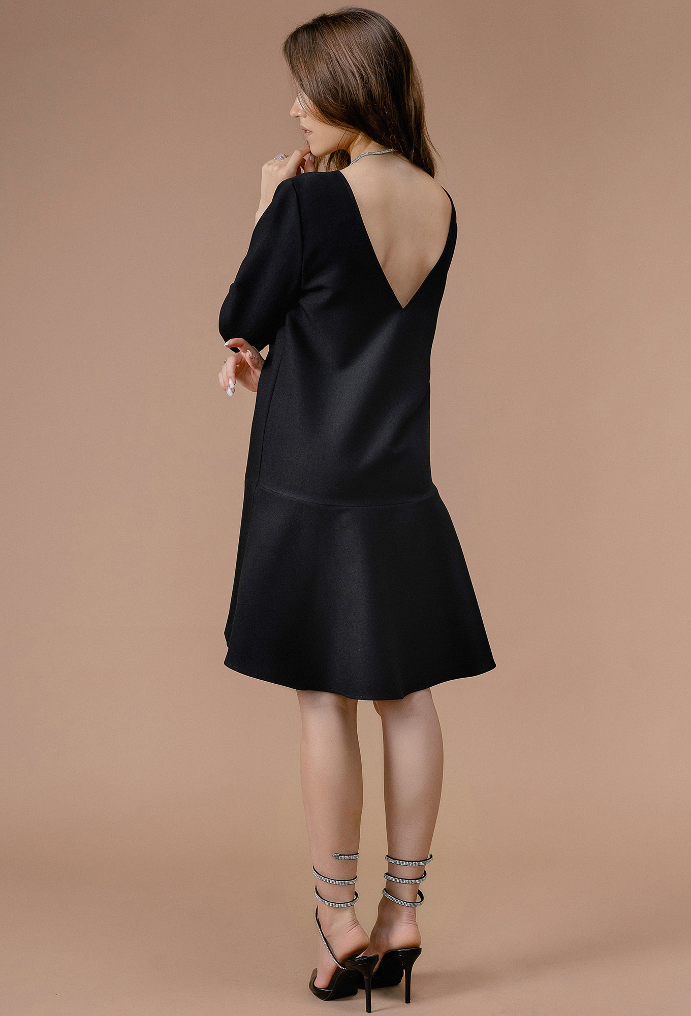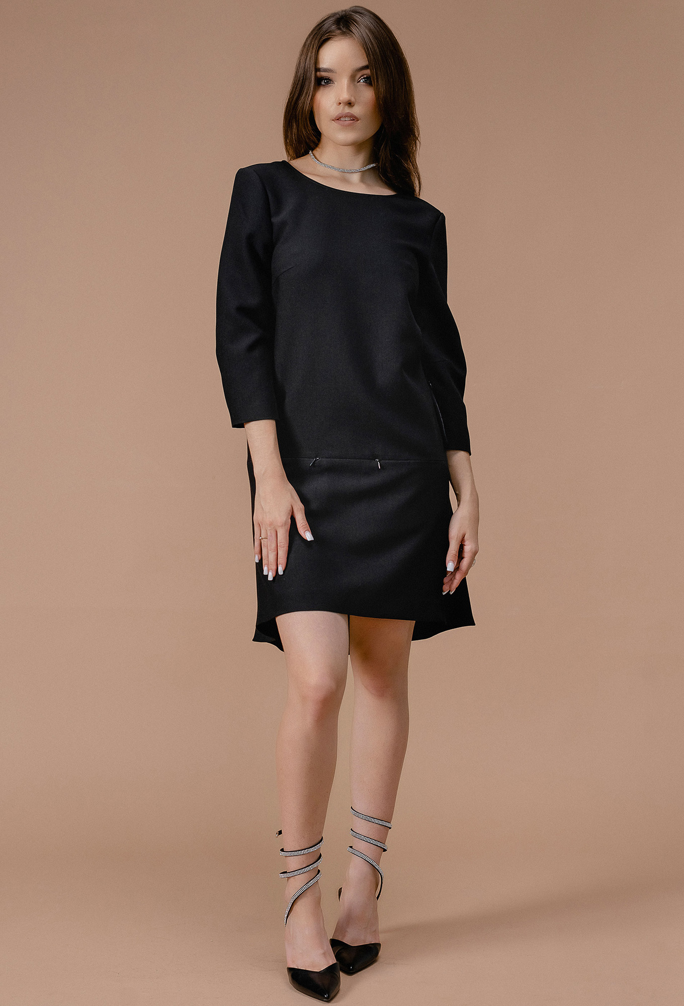 Модель: Джерси 2374 черный Рост: ..показать164 см (девушка на фото ростом 164см) Сезон: Весна-Лето Тип ткани: ПЭ 65%, вискоза 32%, ПУ 3%Платье женское трапециевидного силуэта ,без застежки,с рукавом 3/4 рубашечного типа.с потайными молниями по низу. Перед отрезной по линии бедер с карманами с потайными молниями. По спинке V- образный вырез. По нижней части спинки отрезная линия фигурной формы с воланом с коническим расширением.