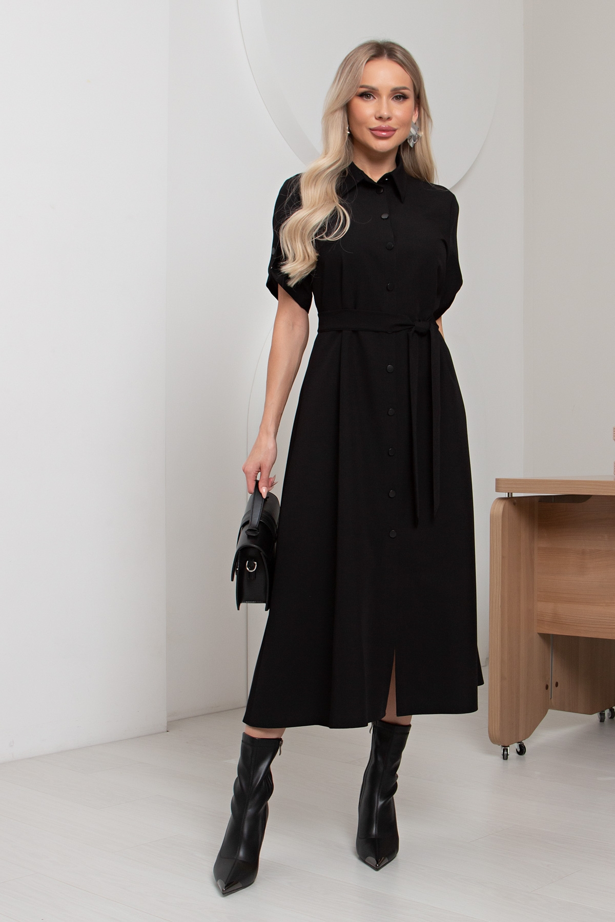 Элегантное платье А-силуэта. Горловина оформлена отложным воротником на стойке, по переду планка с застежкой на петли и пуговицы. Втачной короткий рукав присобран на пату. Низ ровный, без разрезов. Пояс из основной ткани в комплекте. Отличный вариант для офиса.