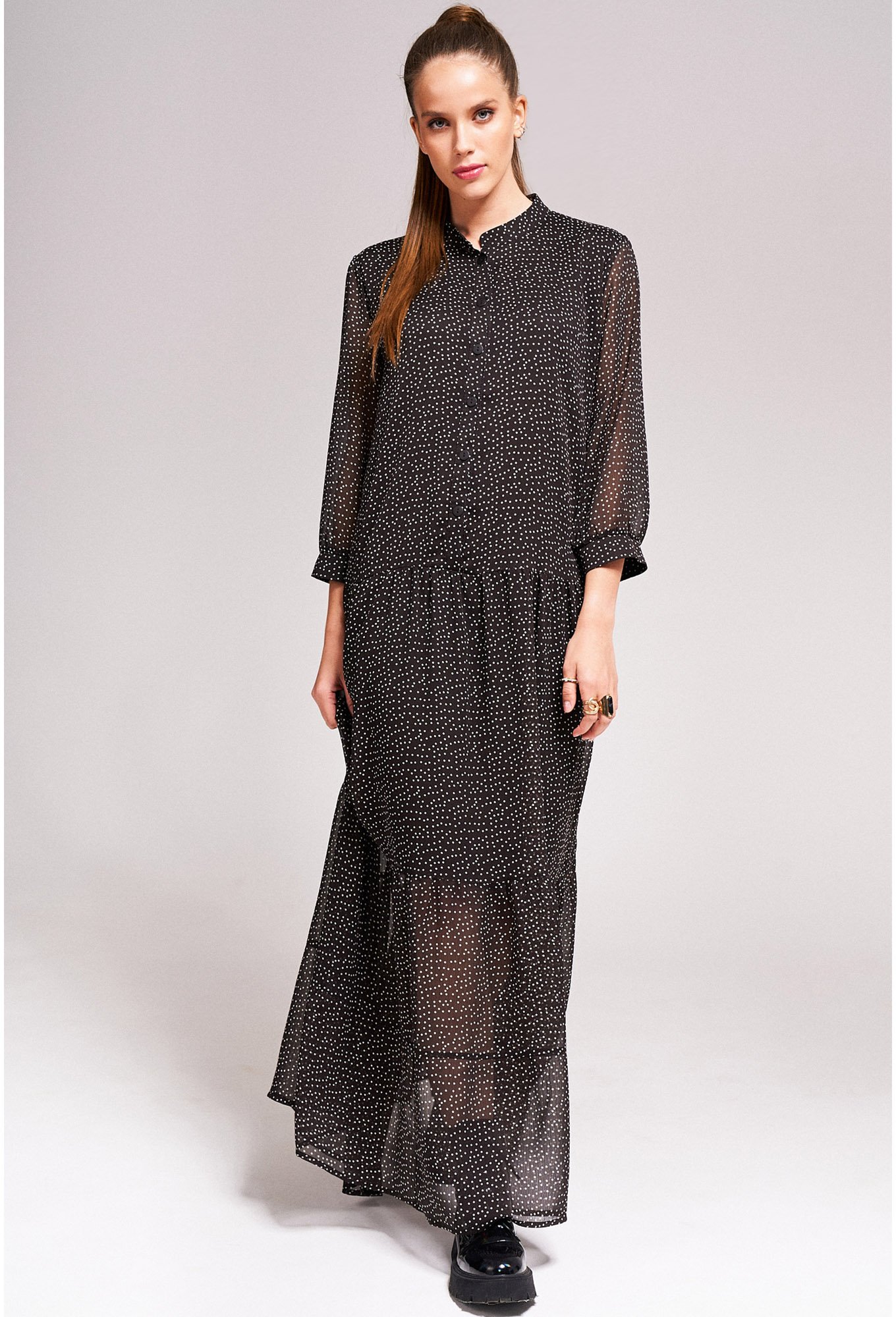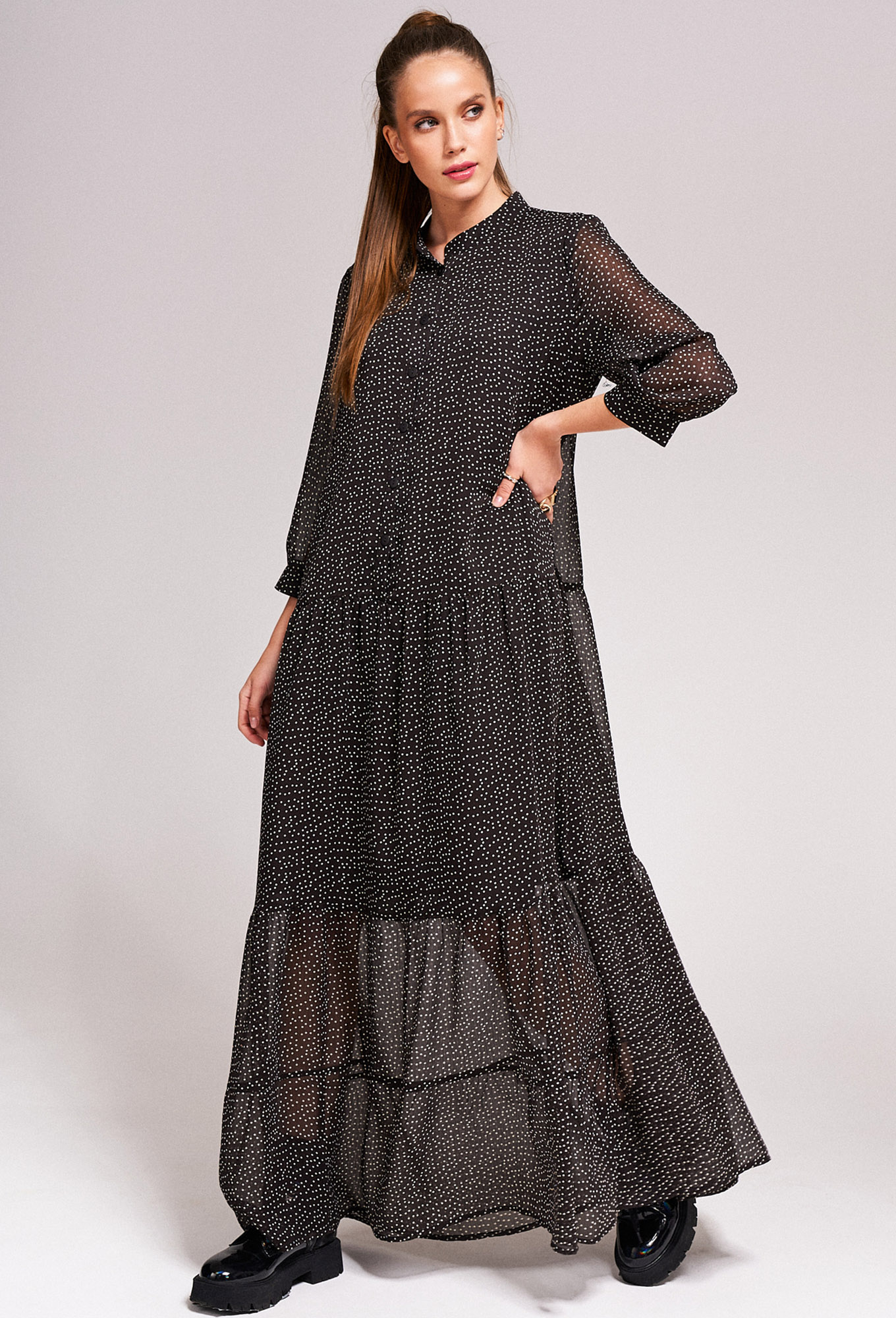 Модель: Кавари 1001 т. коричневый горох..показатьi> Рост: 170 см (девушка на фото 170 см) Сезон: Круглогодичный Тип ткани: Платье -пэ 100%; подкладка - вискоза 80%; полиэстер 17%; спандэкс 3%Платье свободного кроя из шифона длина макси. Верхняя часть переда с планкой которая застегивается на пуговицы. Платье с двумя воланами на сборке. Воротник стойка. Рукав втачной со сборкой по низу с притачной манжетой. Платье на подкладке._x000D_