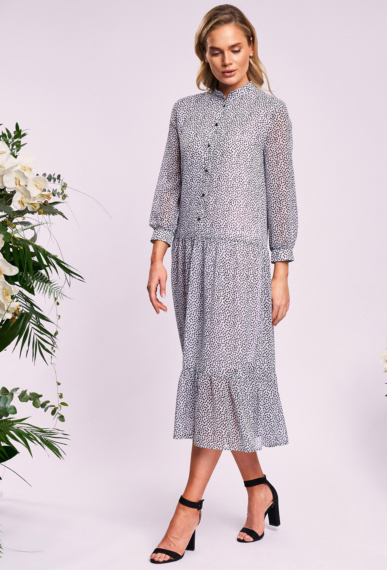 Модель: Кавари 1009 белый принт Р..показатьост: 170 см (девушка на фото 170 см) Сезон: Круглогодичный Тип ткани: платье -полиэстер 100% подкладка- вискоза 80%; полиэстер 17%; спандэкс 3%Платье свободного кроя из шифон длина миди. Верхняя часть переда с планкой которая застегивается на пуговицы. Платье с одним воланом на сборке.Воротник стойка. Рукав втачной со сборкой по низу с притачной манжетой. Платье на подкладке._x000D_
