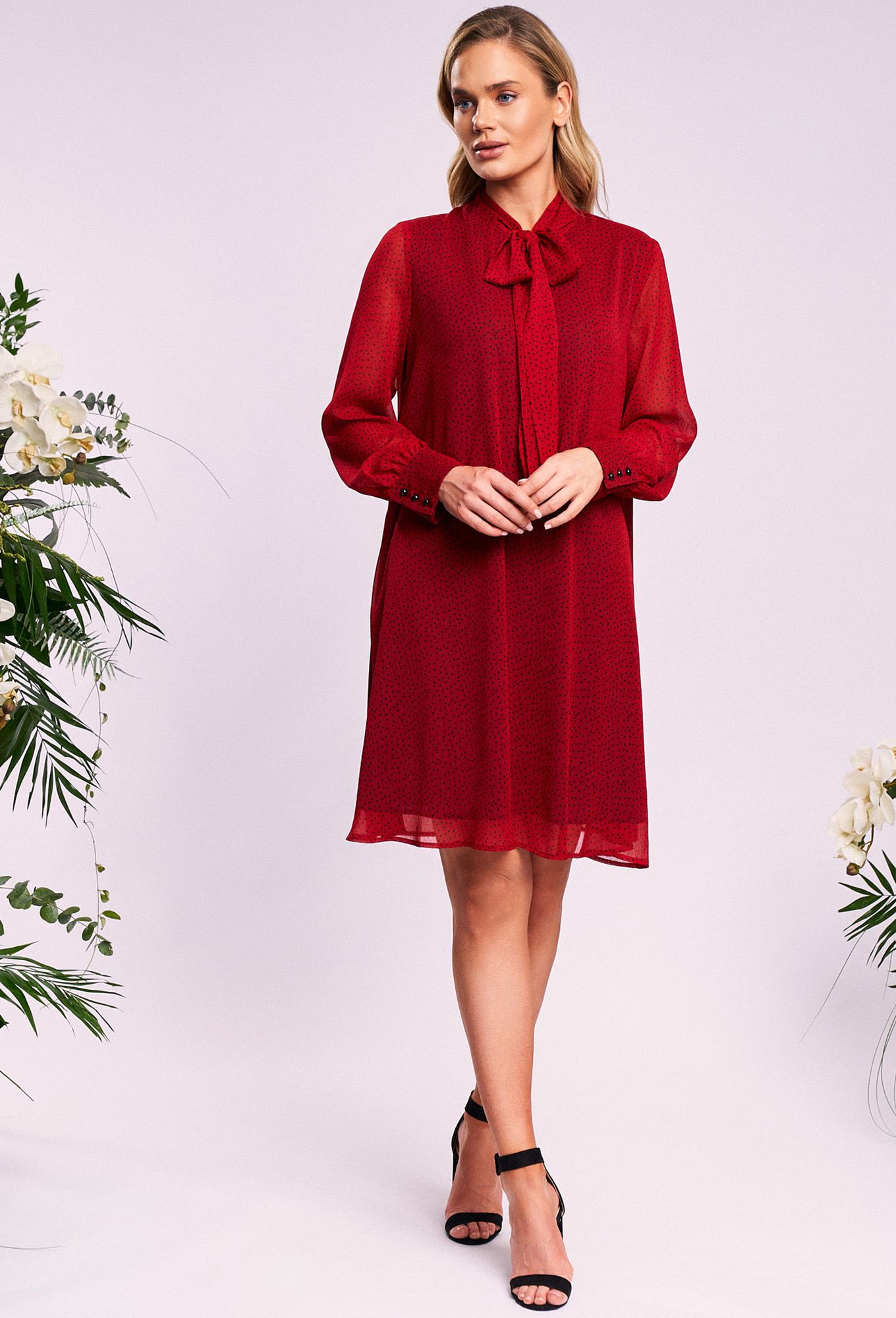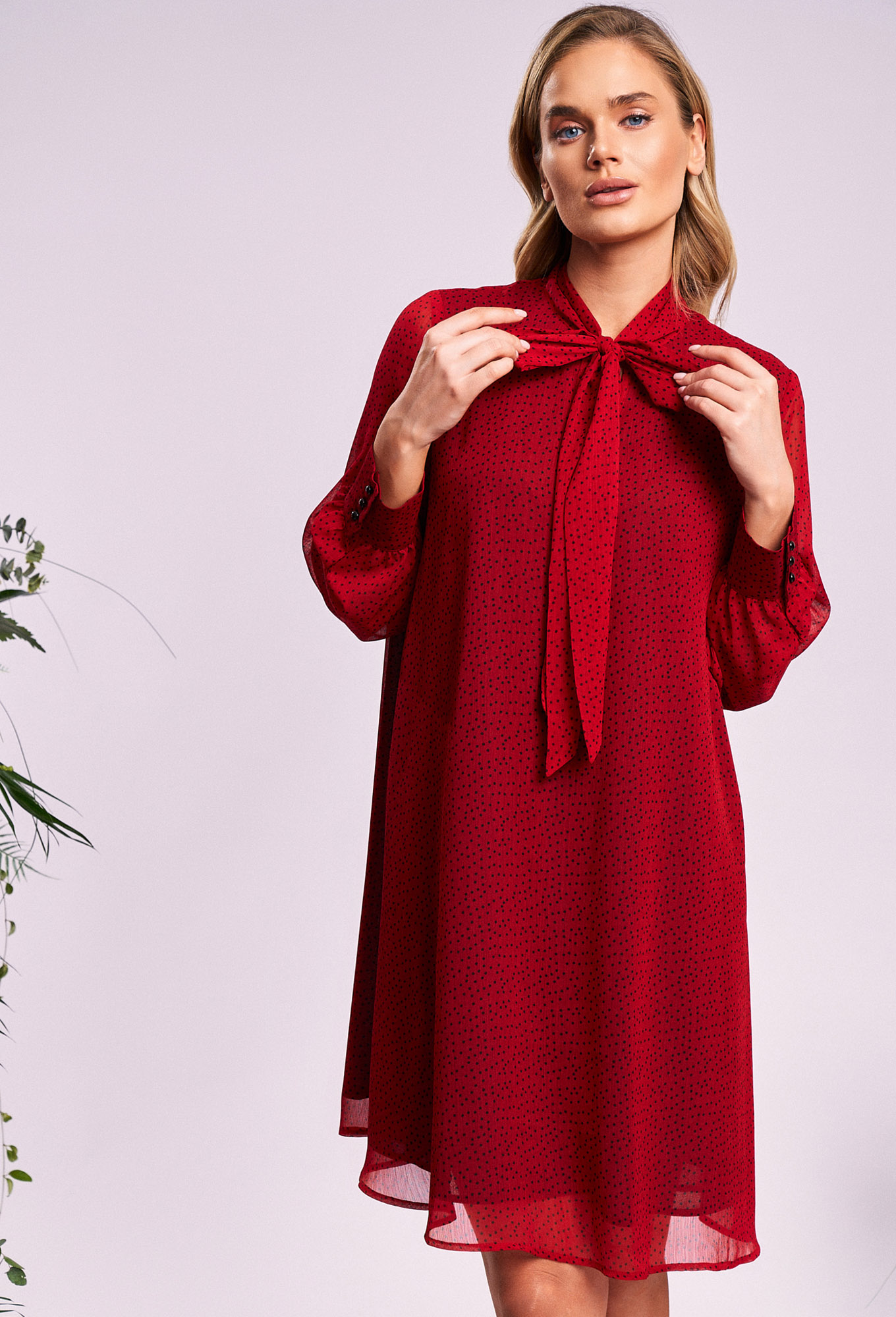 Модель: Кавари 1012 красный горох ..показать>Рост: 170 см (девушка на фото 170 см) Сезон: Круглогодичный Тип ткани: платье-пэ 100%; подкладка- вискоза 80%; пэ 17%; спандекс 3%Платье свободного силуэта, расширенное к низу, выполнено из шифонового полотна с воротником-стойкой переходящим в бант. Рукава в изделии втачные одношовные со сборкой по низу с отрезной манжетой на 3 петли и пуговицы. Платье на подкладке. Ремень не входит в комплект. _x000D_