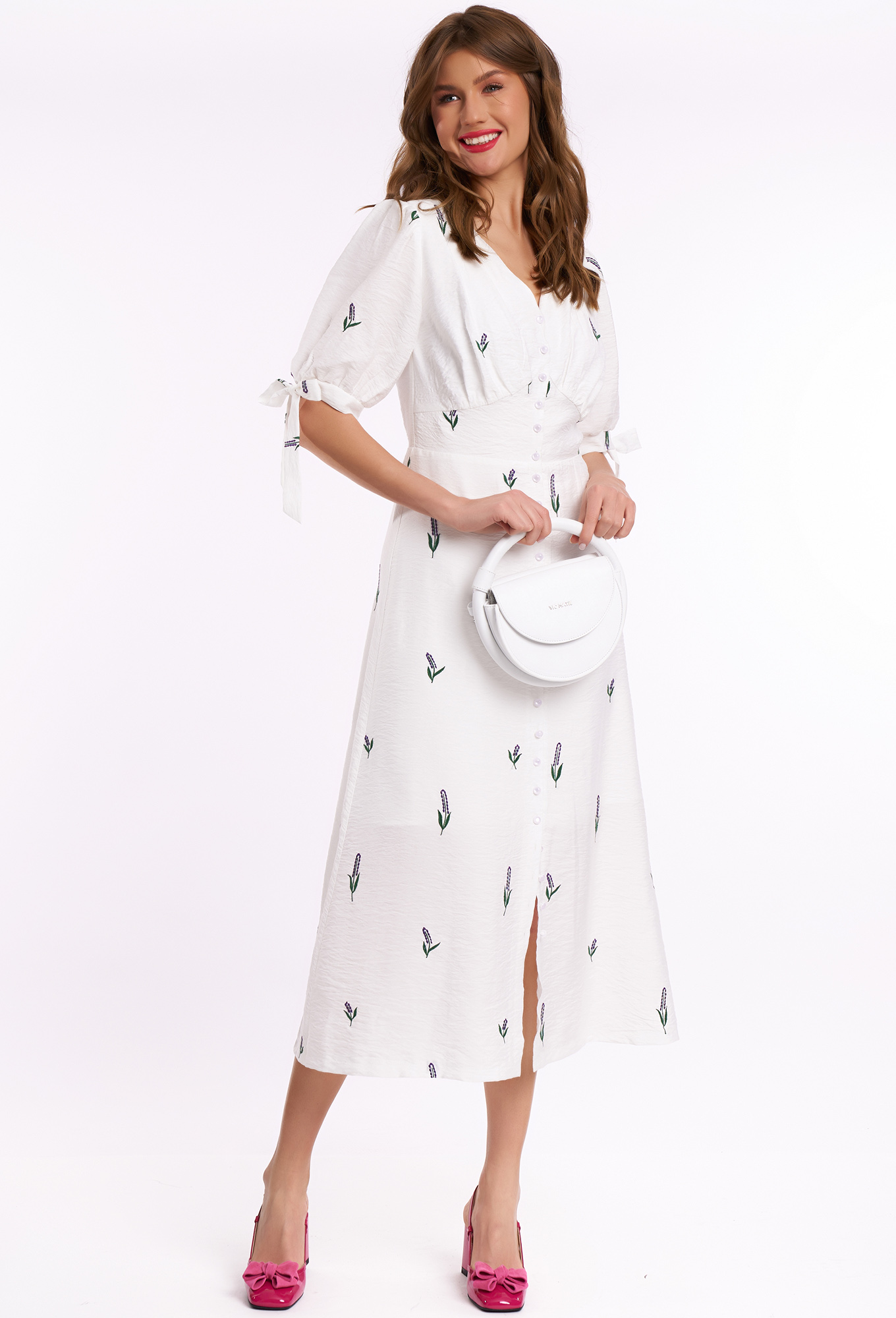 Модель: Кавари 1036 лаванда Рост:..показать 170 см (девушка на фото 170 см) Сезон: Весна-Лето Тип ткани: Платье - вискоза 87%; полиэстер 13%; подкладка -вискоза 100%Нежное женское платья прилегающего силуэта, отрезное по линии талии. Перед с фигурной кокеткой и сборкой под грудью. Юбка конической формы длиной ниже линии колена. Вырез горловины глубокий. V-образный. Рукав втачной со сборкой по линии отката и низу. Манжет притачной с завязкой на бант. Платье с застежкой на петли и пуговицы.